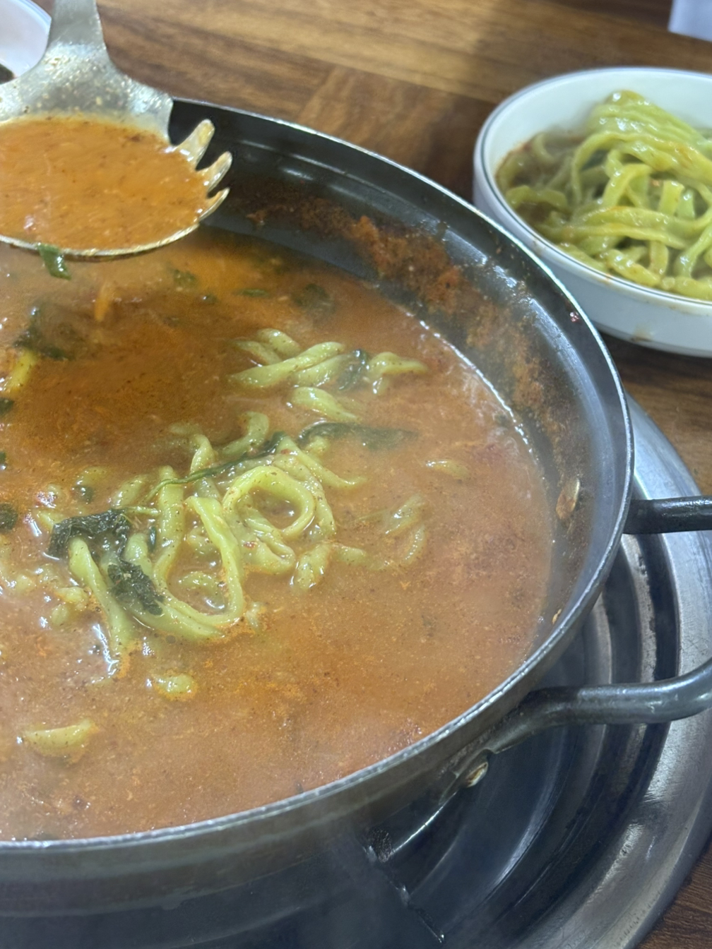 얼큰한 물고기 맛에 나물 맛이 곁들여진 초록색 면까지, 아주 맛있게 먹었다.