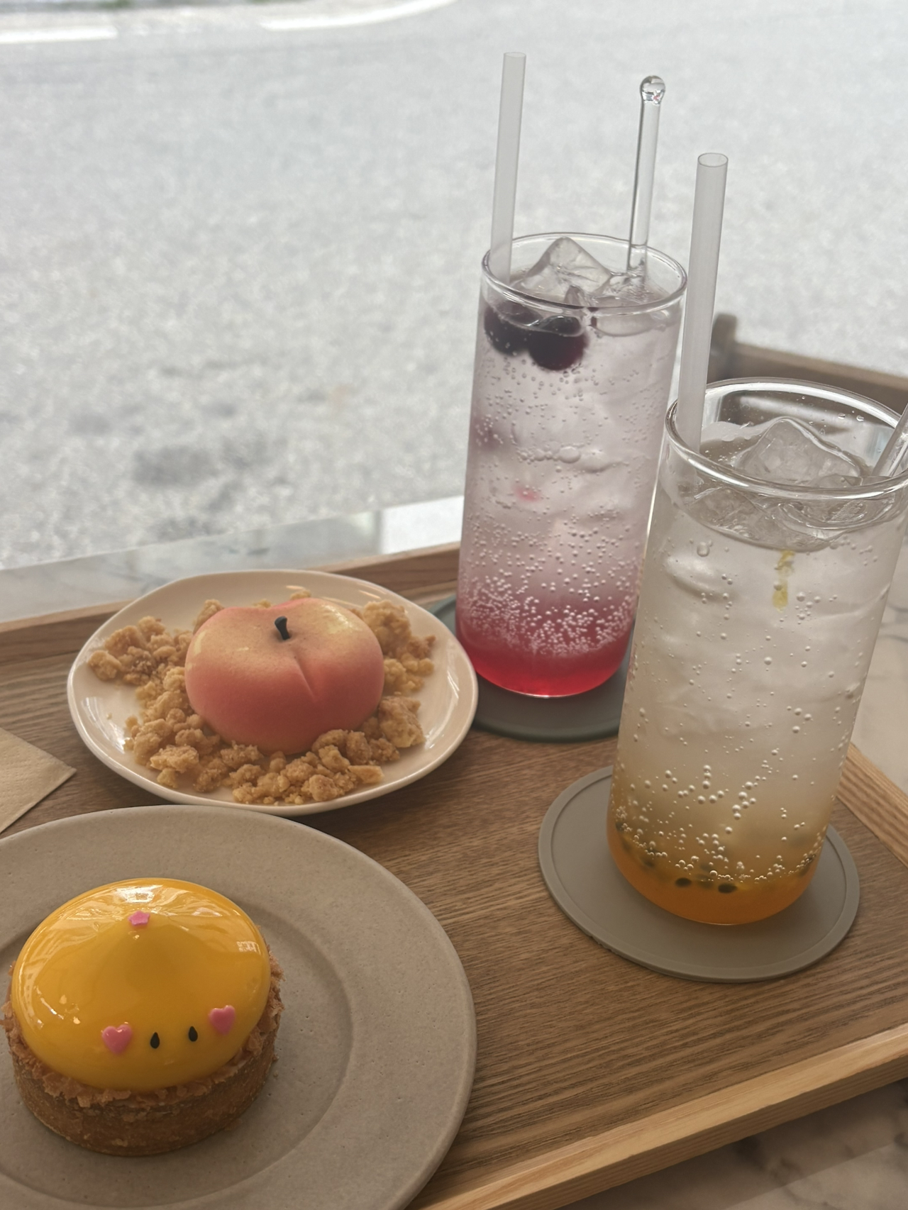 대전 ‘파티세리러츠‘ 카페에서 오미자에이드, 패션후르츠에이드, 케이크 두 종을 먹었다.