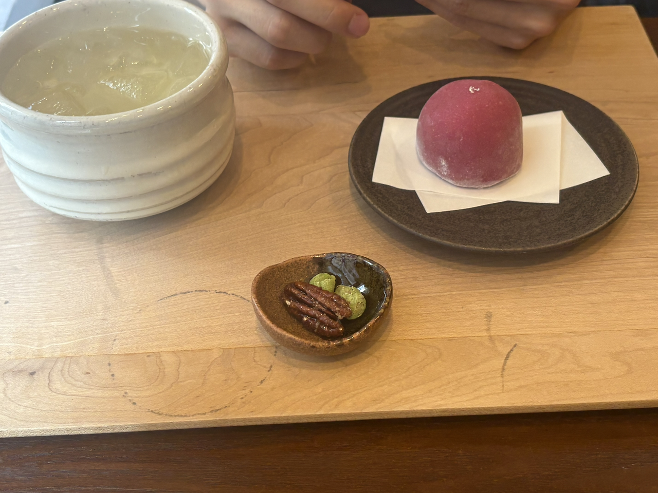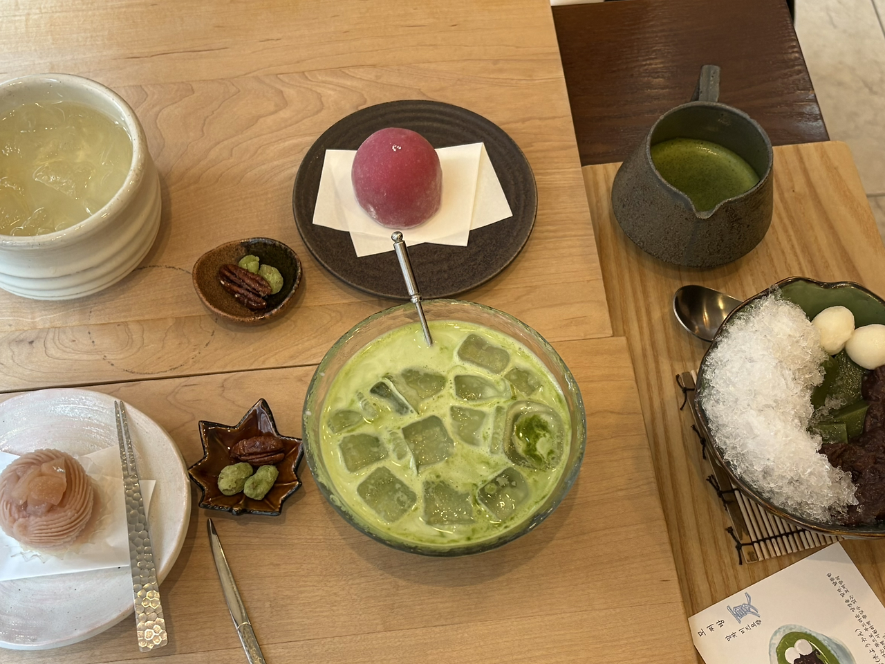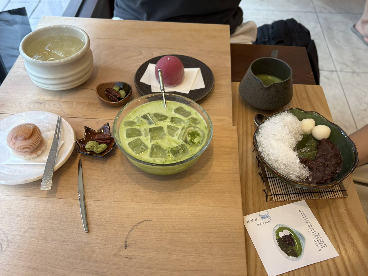 거의 디저트 파인다이닝 느낌이었다. 생소한 메뉴인 ‘미즈요캉‘은 ‘물양갱‘이라는 뜻이다. 진한 말차를 고운 얼음, 경단, 통팥, 양갱이 들어있는 그릇에 부어 마셨다. 말차 빙수 같기도 했는데 부드러운 양갱도 있어서 특이했다.
