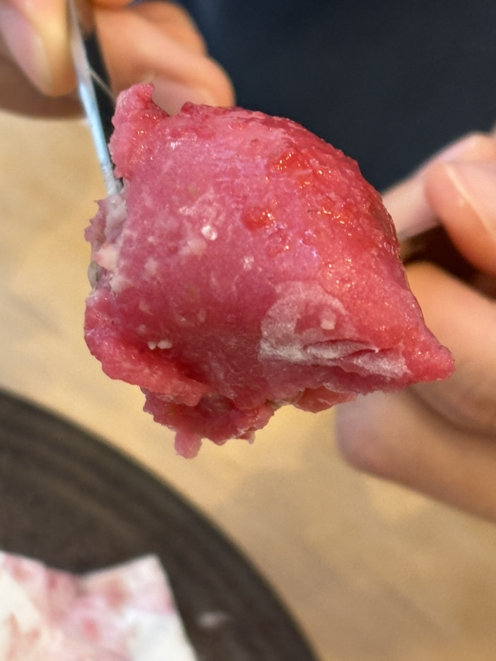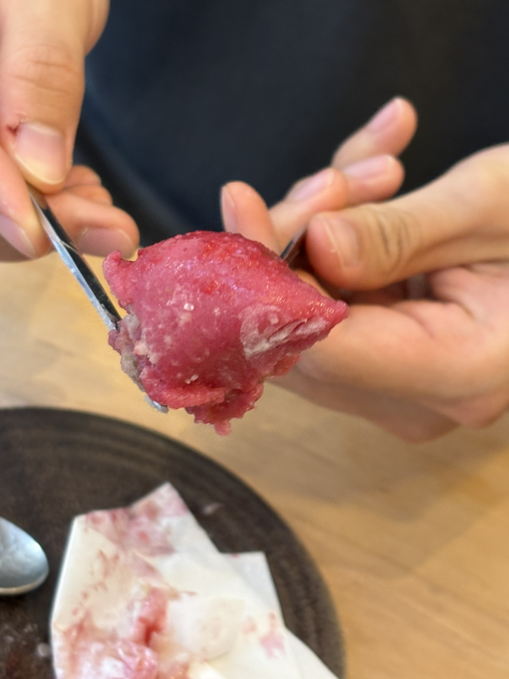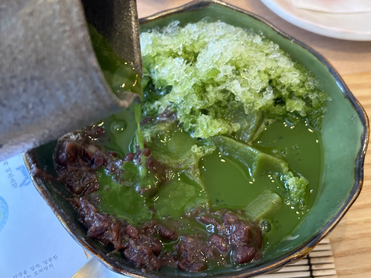 거의 디저트 파인다이닝 느낌이었다. 생소한 메뉴인 ‘미즈요캉‘은 ‘물양갱‘이라는 뜻이다. 진한 말차를 고운 얼음, 경단, 통팥, 양갱이 들어있는 그릇에 부어 마셨다. 말차 빙수 같기도 했는데 부드러운 양갱도 있어서 특이했다.