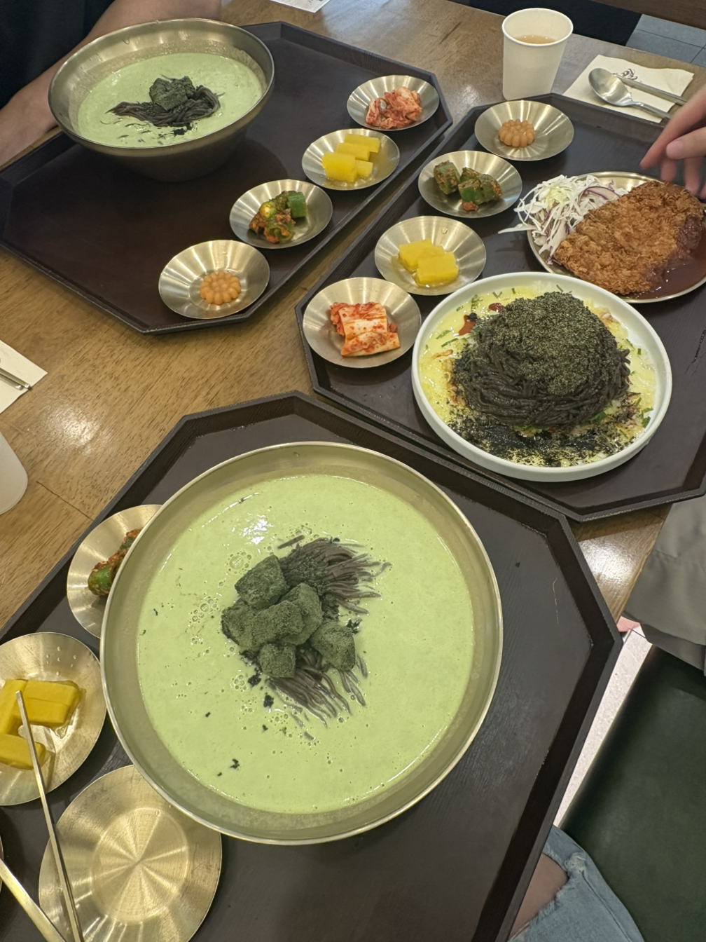 말차 콩국수는 고소한 콩국에 슴슴한 말차맛이 났다. 달콤한 떡도 여러 개 들어있어서 맛있게 먹었다. 메밀면도 쫄깃해서 완벽했다. 들기름 메밀 돈까스 세트를 시키신 선배님이 나눠주신 돈까스 한 쪽, 사이드로 나온 미니 약과도 맛있게 먹었다.