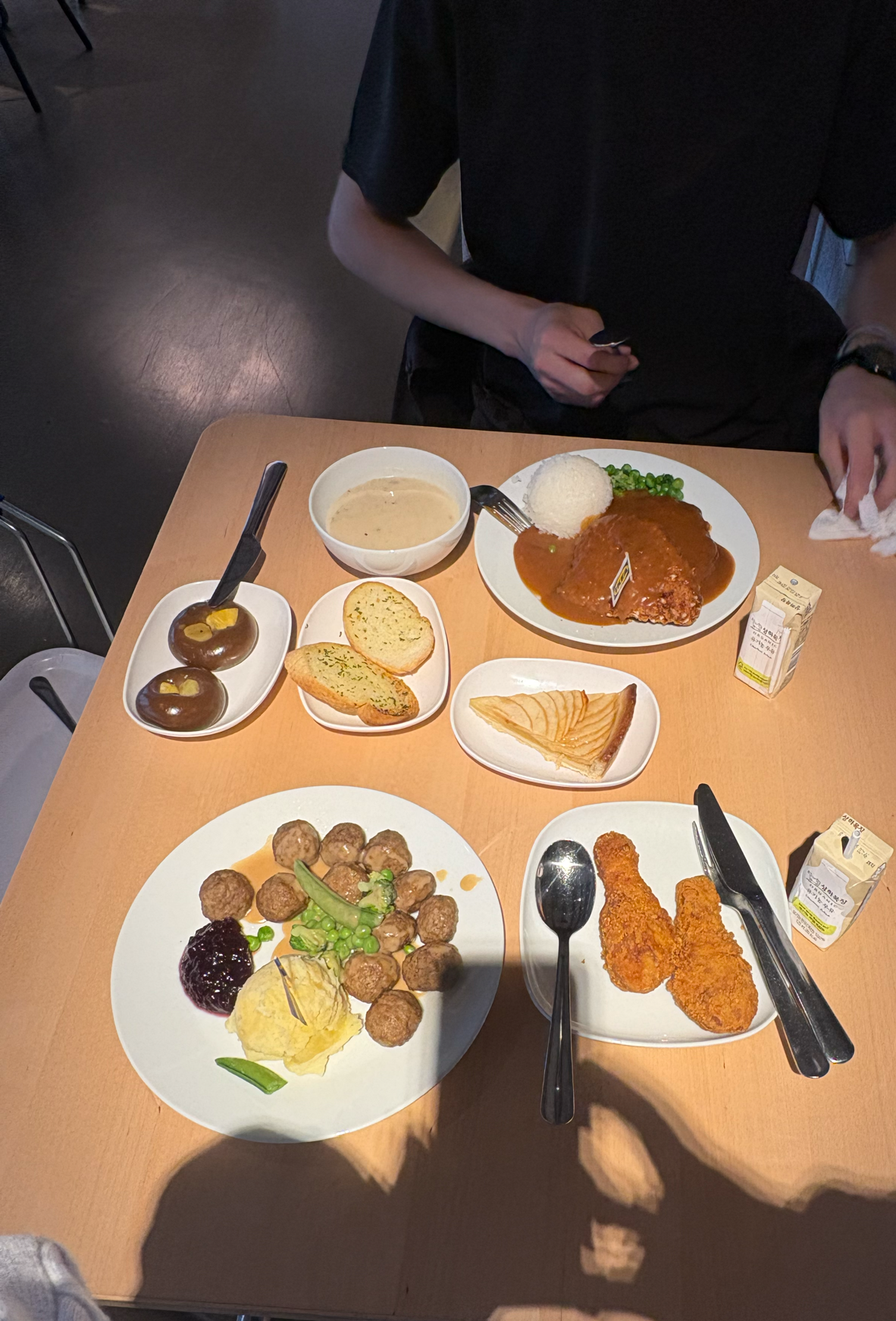 유명한 이케아 미트볼과 라즈베리잼, 그린빈, 으깬 감자가 맛있었습니다! 돈까스는 평범했습니다. 버섯 스프는 생각보다 짜지 않고 버섯맛이 꽤 강했습니다.