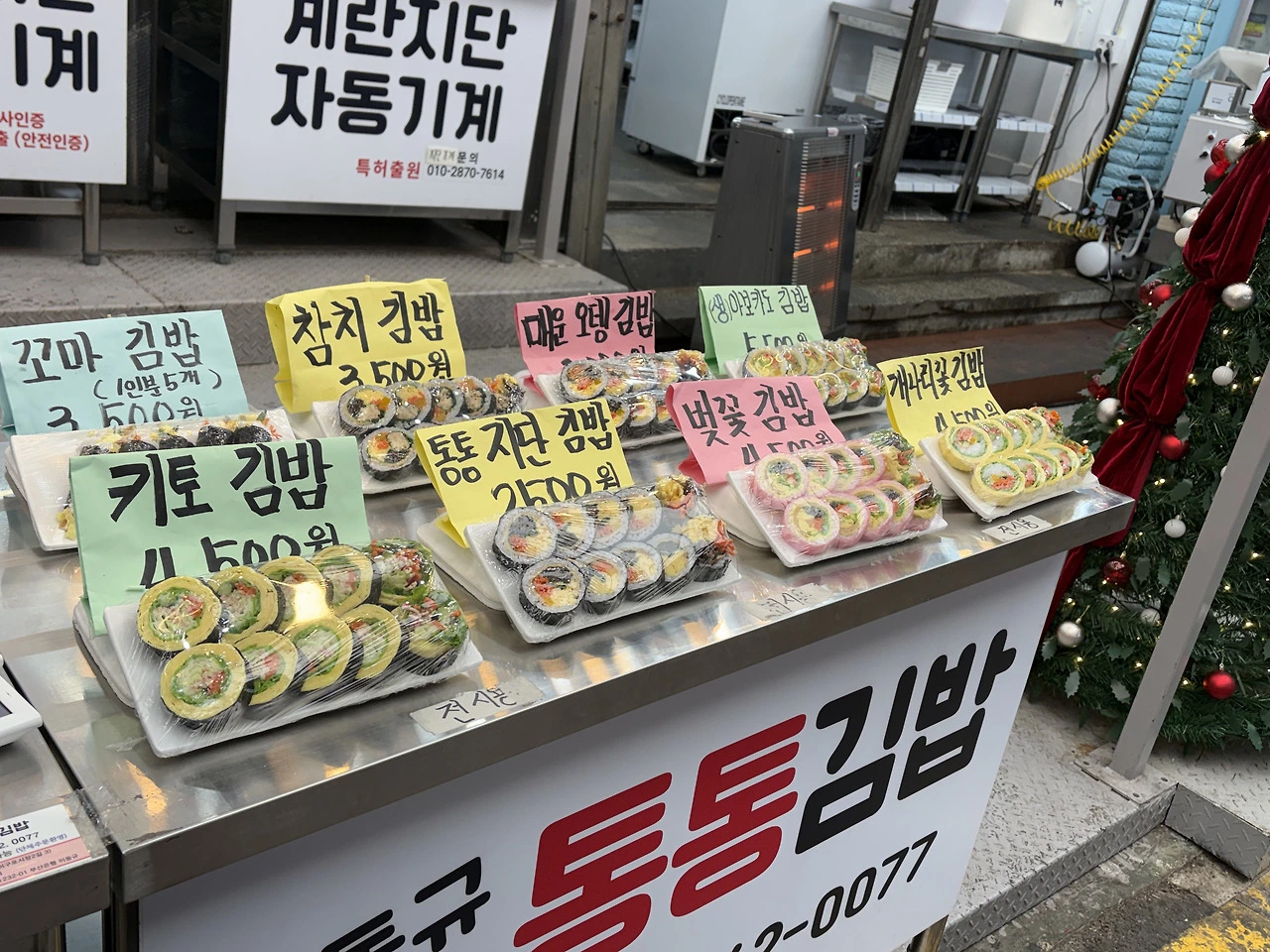 4500원짜리 키토김밥, 2500원 지단김밥, 분홍 콩 반죽을 김 대신 싼 벚꽃김밥 4500원도 샀다. 저녁때 맛볼 예정이다.
