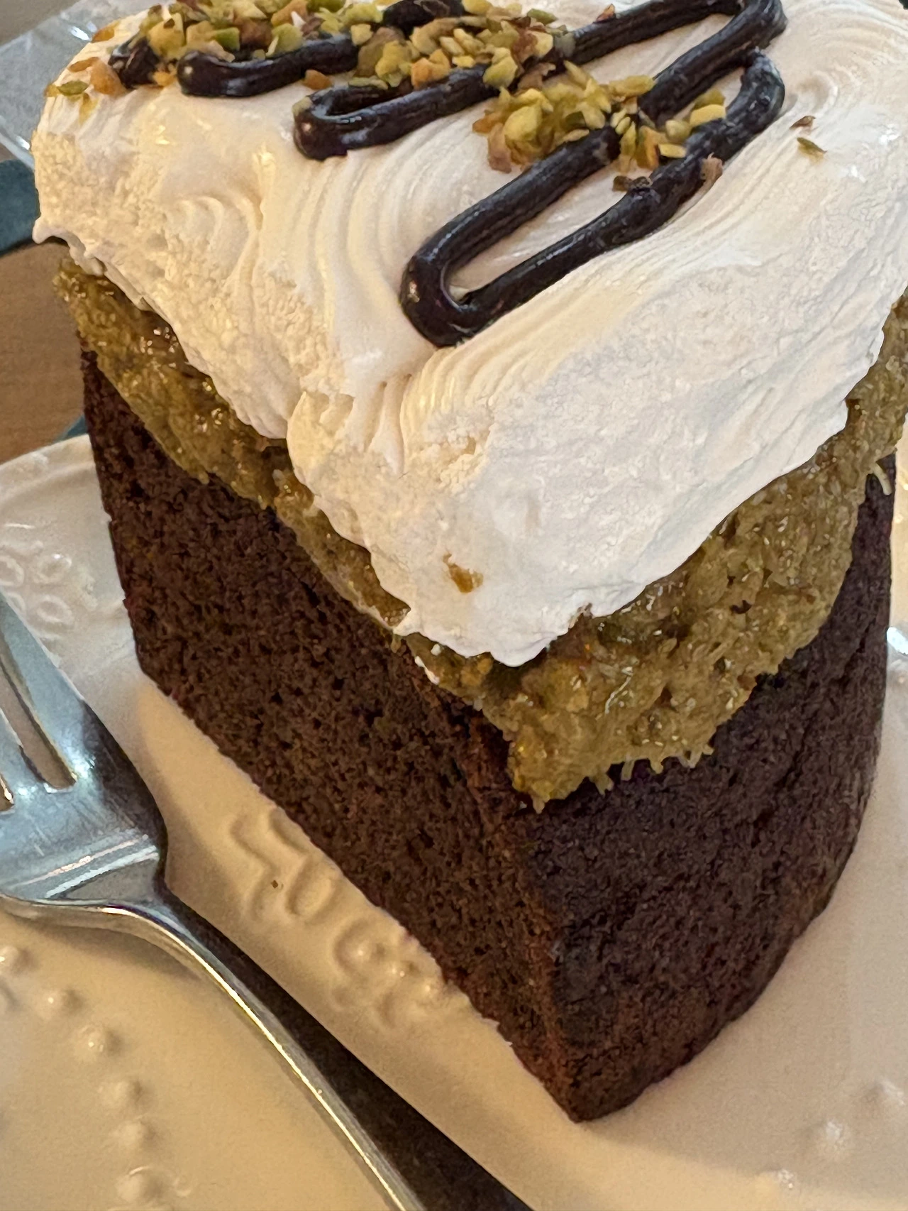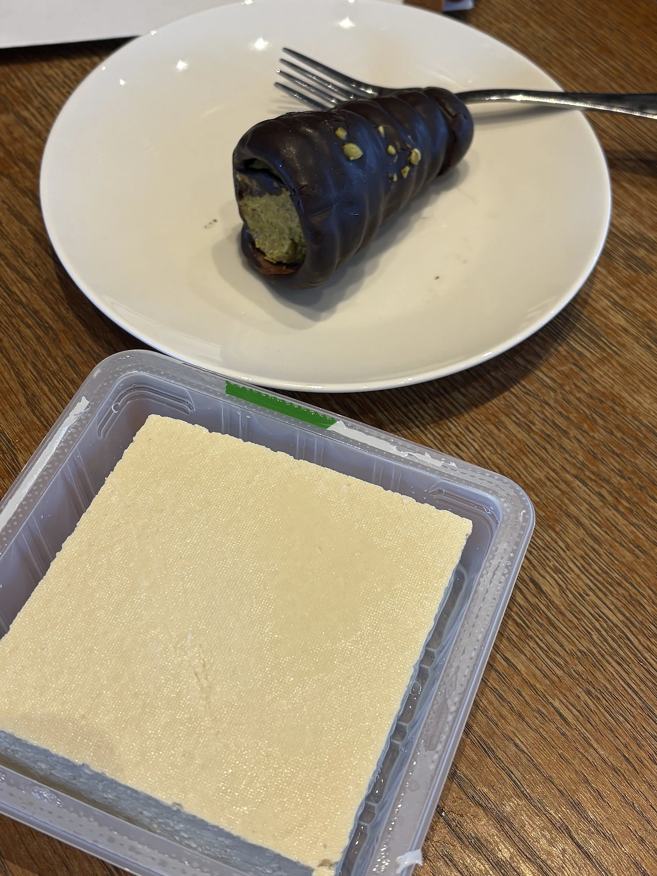 피스타치오, 초코, 두부의 조합이 아주 맛있다. 처음 접한 건 비건 카페 인천 송도 지구본에서 두바이 스타일 케이크에 두부 크림이 올라간 걸 맛본 때였다.