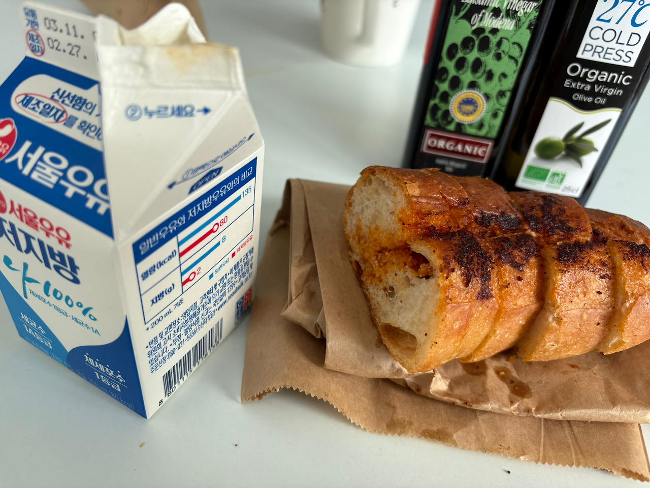 대학 기숙사에 올 때 먹을 것 세 가지를 챙겨왔다. 올리브오일, 발사믹, 햇반3개. (햇반은 완전 비상식량인지 한 번도 안 먹었다) 명란 바게트는 이미 간이 돼 있었지만 올리브 오일, 발사믹과 어울렸다. 해외 여행 갈때 고추장 튜브를 들고다니는 한국인들 이야기를 들은 적 있다. 요새 내 입맛대로라면, 올리브오일과 발사믹 식초를 들고 있다면 든든하게 전세계를 돌아다닐 수 있을 것 같다.