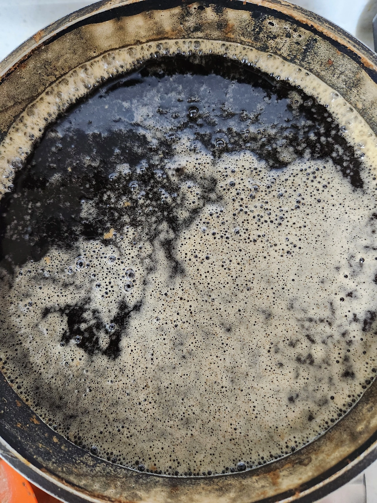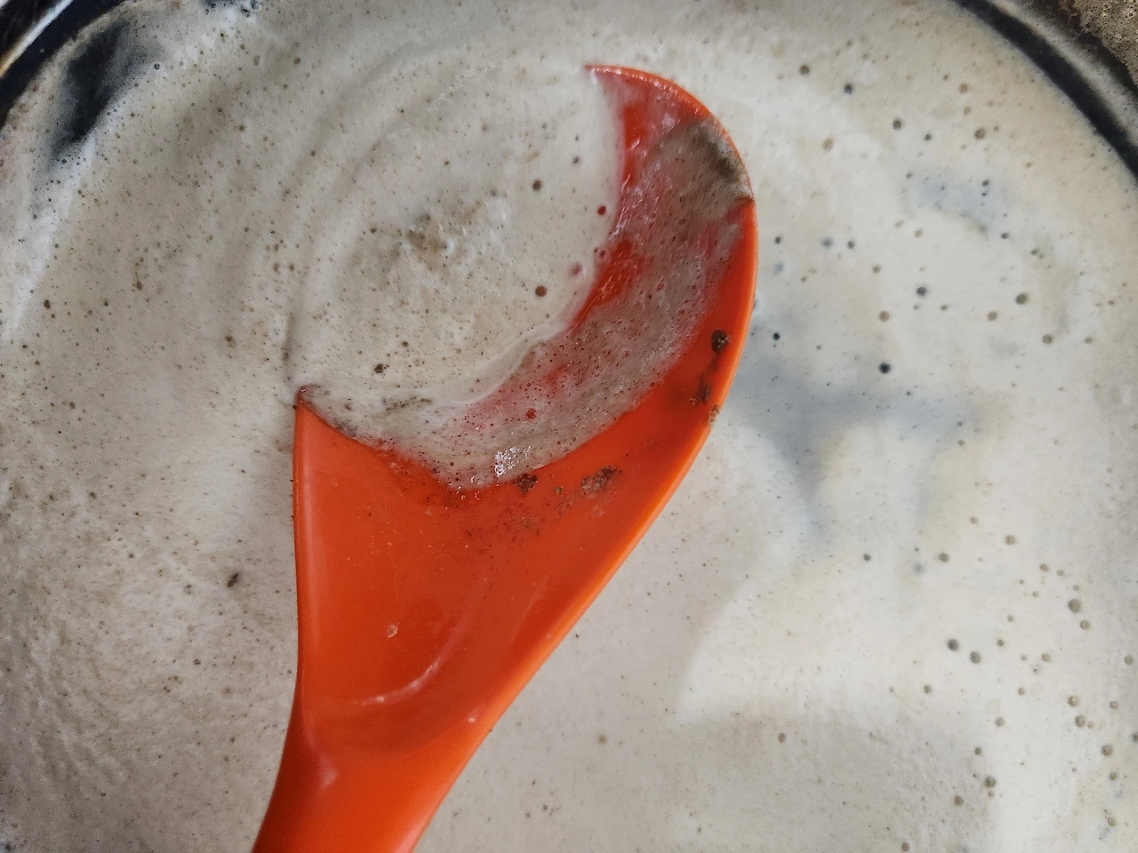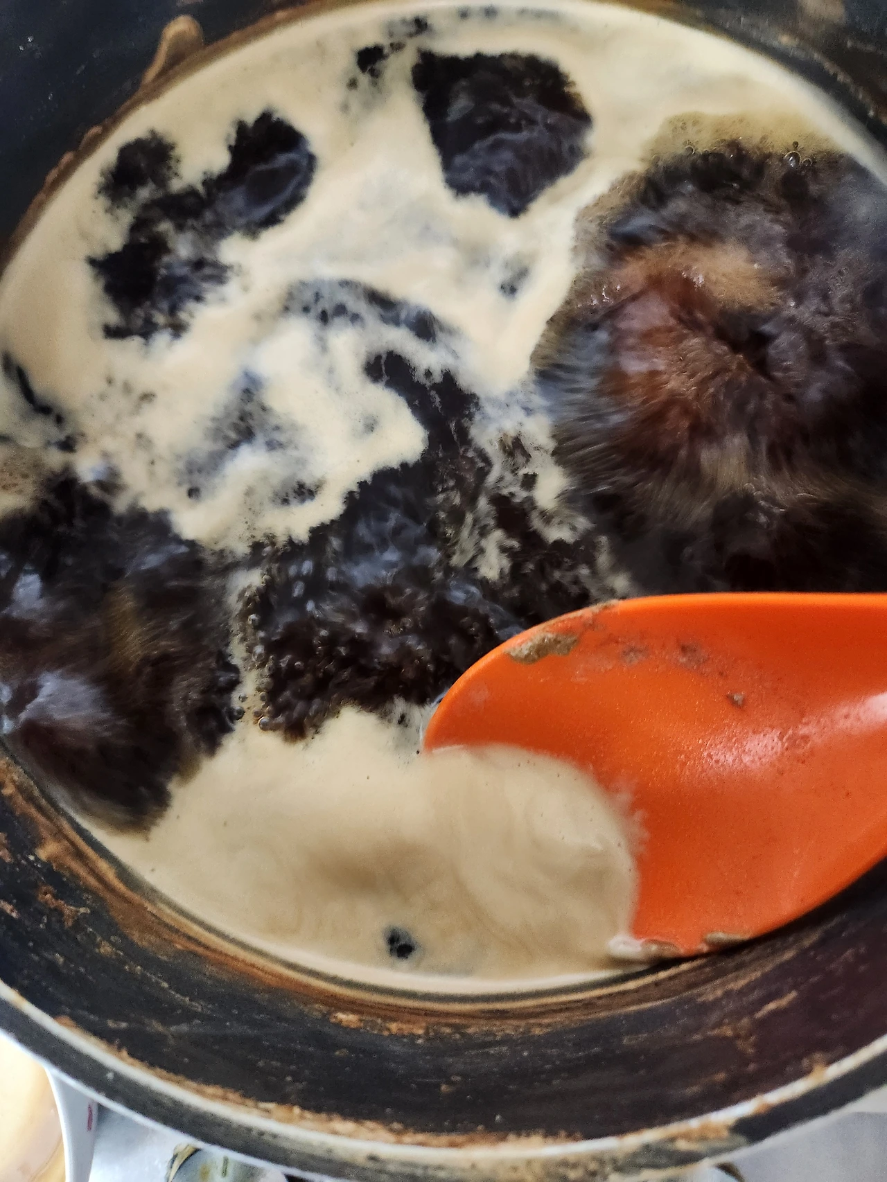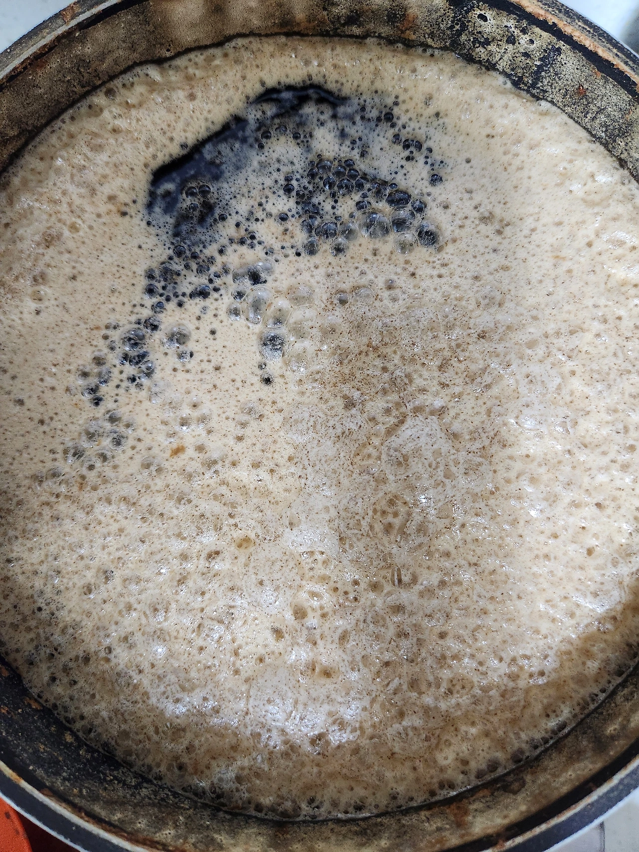 냄비 벽에 들러붙는다. 거품이 많아진다.