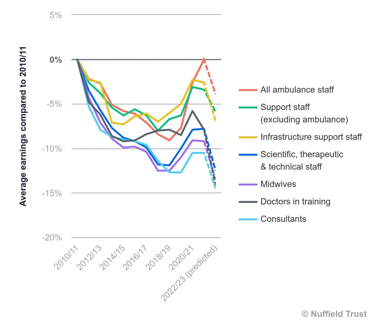 환자가 줄을 서 있고 일은 밀려 있는데 영국 보건의료 서비스 분야에서는 희한하게 일 할수록 가난해집니다. 위 그래프는 보건의료 종사자들의 실질 임금을 2010년을 기준으로 나타낸 것입니다. 팬데믹 기간에 일시적으로 상승할 뿐 추세적으로 실질임금이 줄어드는 걸 볼 수 있습니다. 직종에 따라 10년 사이에 실질임금이 10% 가량 줄어들기도 했군요.