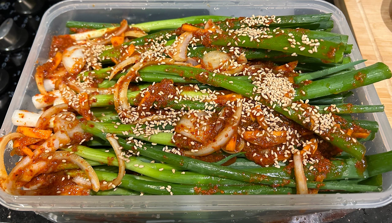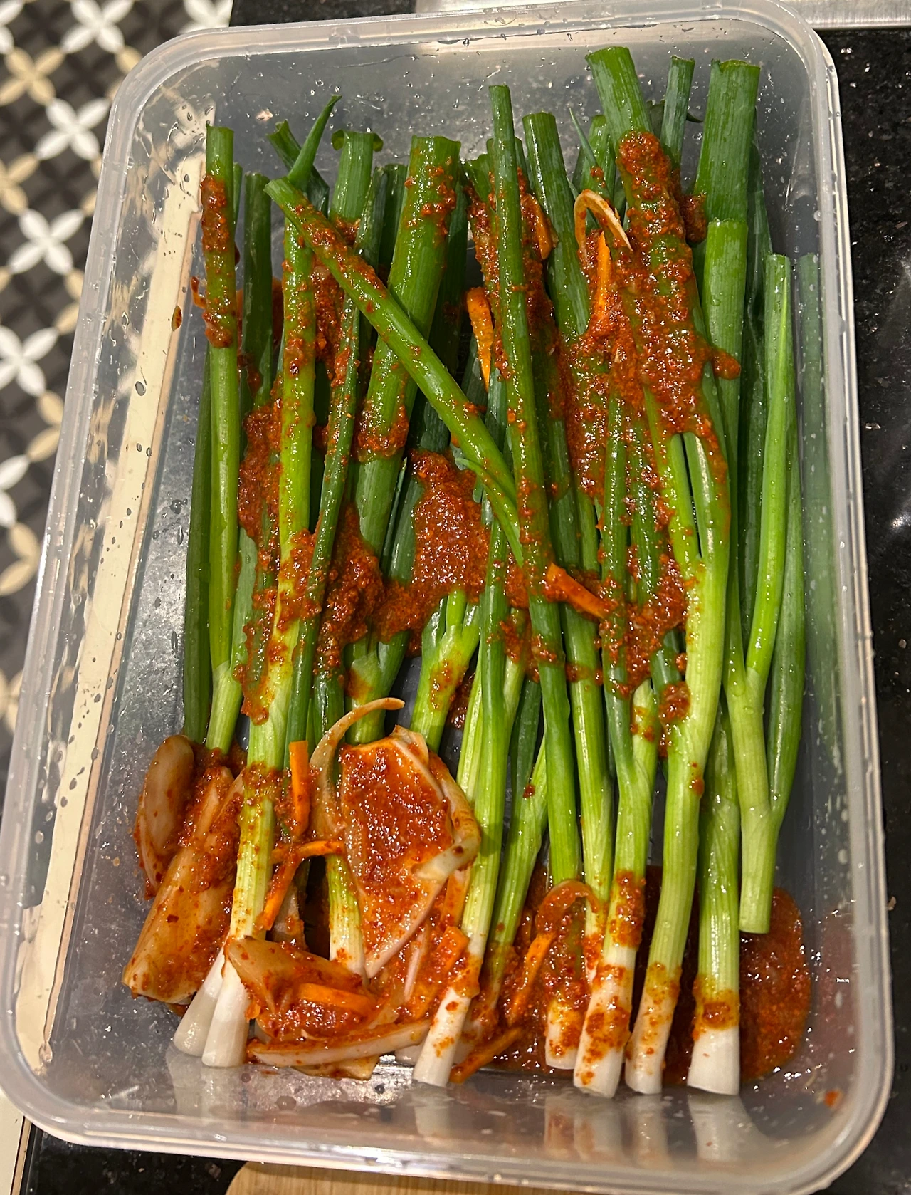 곱다 고와. 당근을 썰어넣은 나를 추앙해. 층층이 파를 깔고 양념을 끼얹은 뒤 통깨 소나기로 마무리. 파김치 한 통이 완성됐다.