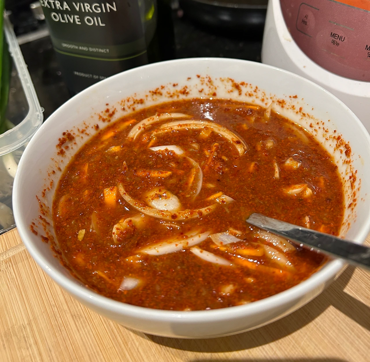 새미네는 액상 양념에 고춧가루만 넣으면 된다고 했지만 나는 양파와 당근을 좀 썰어넣는다. 맛도 맛이지만 색깔과 모양을 위해. 그리고 감칠맛을 좀 올리기 위해 미자 언니네 액젓도 소환! 맛있으니까 프리미엄이겠지,라고 생각하자.