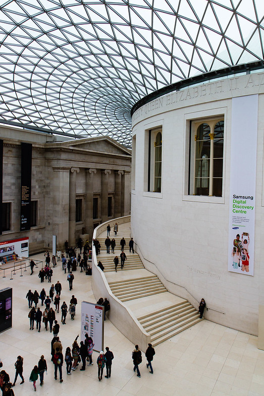 멤버스룸에서 2에이커 규모의 Great Court 공간을 내려다보는 전망은 웅장하다. 지나다니는 전 세계에서 온 사람들을 내려다보는 것만 해도 즐겁다. 또 창 밖으로 Norman Foster가 디자인한 지붕이 보인다. 엽서에 단골 사진으로 나오는 지붕 아래는 원래 야외 공간이었다고 한다. 2000년에 지붕을 얹어서 거대한 실내 공간이 열렸다. 그 공간에는 관람객들이 쉴 수 있도록 테이블과 벤치가 마련됐다. 거기서 쉬던 중년 여성 런더너는 지붕 없을 때 그곳 바닥은 비만 오면 진흙탕이 되곤 했다며 웃었다.
