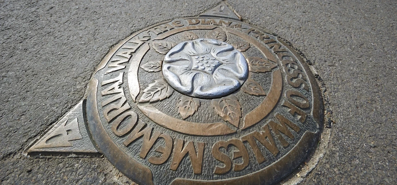 산책로를 걷다 보면 독특한 바닥 표식을 발견할 수 있다. 원형 금속 판 중앙에는 다이애나 왕세자비의 이름이 새겨져 있고, 장미 문양과 화살표가 디자인되어 있다.