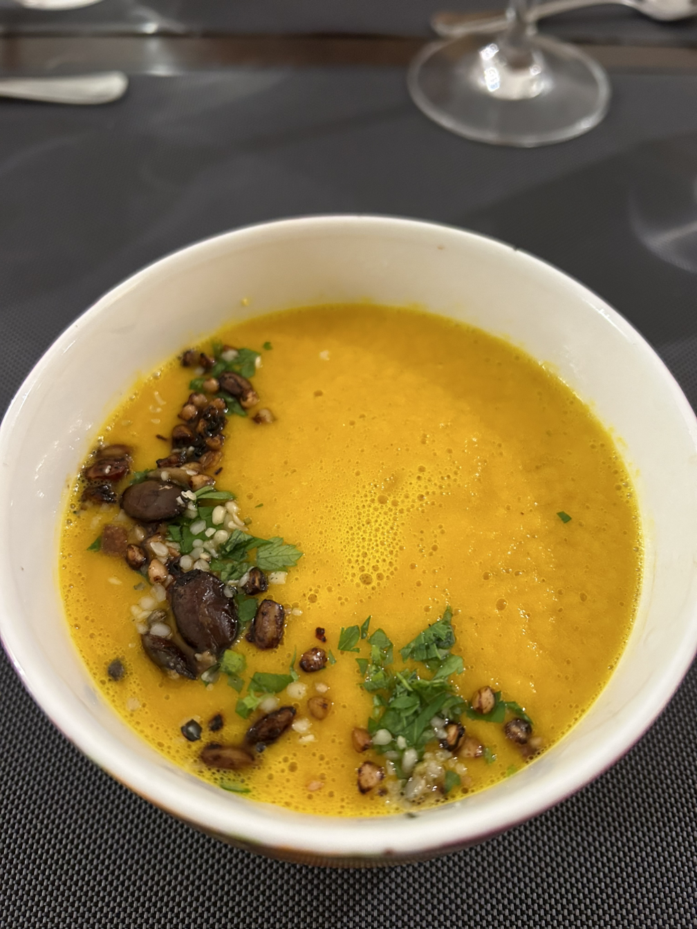 그리고 음식. 와 최고였다. 나는 연어 스테이크와 와인. 아이는 치킨과 주스. 감탄 연발하며 먹는데 딱 스마트폰 배터리가 방전되어서 사진은 첫번째로 나온 수프밖에 없다.