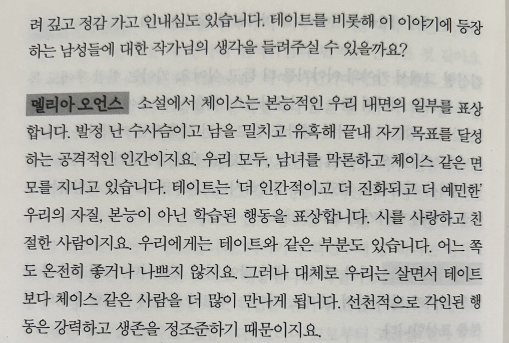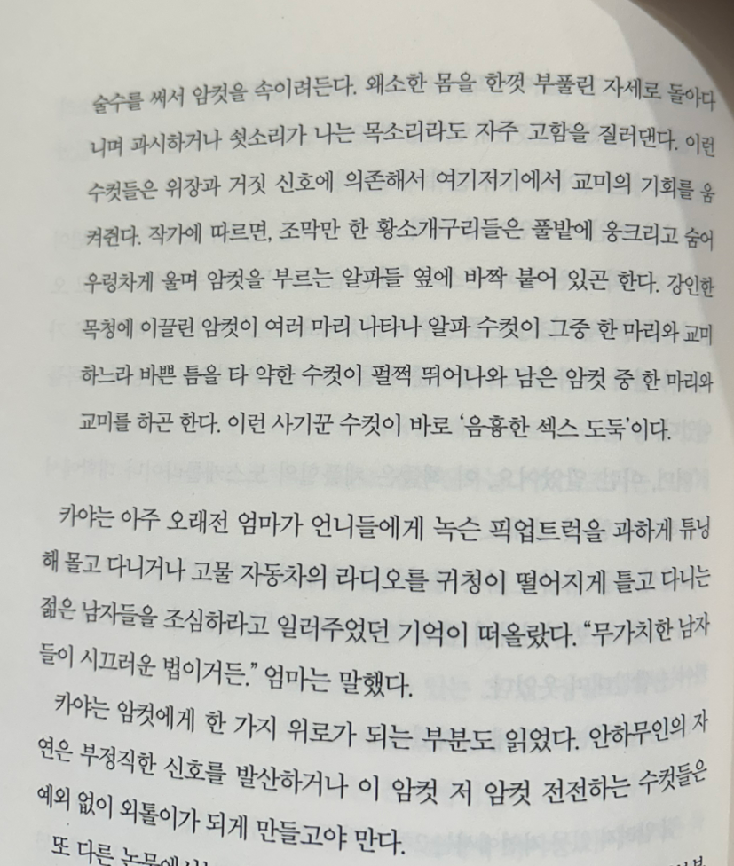 그 길로 동네 커피숍에 앉아 쓰디쓴 커피를 한 잔 시켜두고 앉았다. 아니나 다를까 엄청난 속도로 책이 읽힌다. 다음 이야기가 너무너무 궁금하다. 전문 소설가가 아니라 동물행동학으로 박사학위를 받은 학자가, 그것도 노년에 쓴 첫 소설이라는 사실이 믿기지 않을 정도로 이야기의 전개가 좋았다.