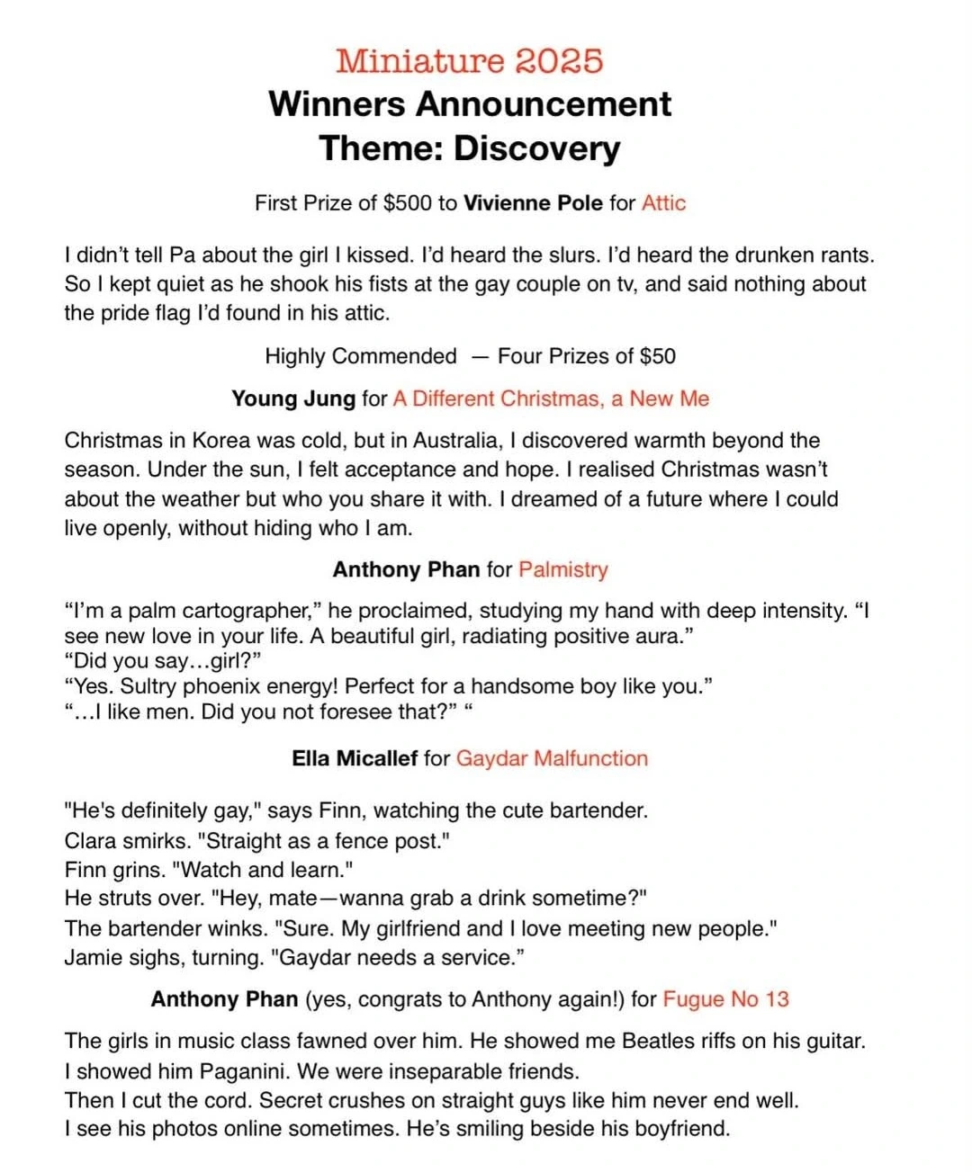 You have probably seen on facebook by now that you are the winning writers of Miniature this year. I f you haven’t seen go to OutStanding Facebook Page right away!!!