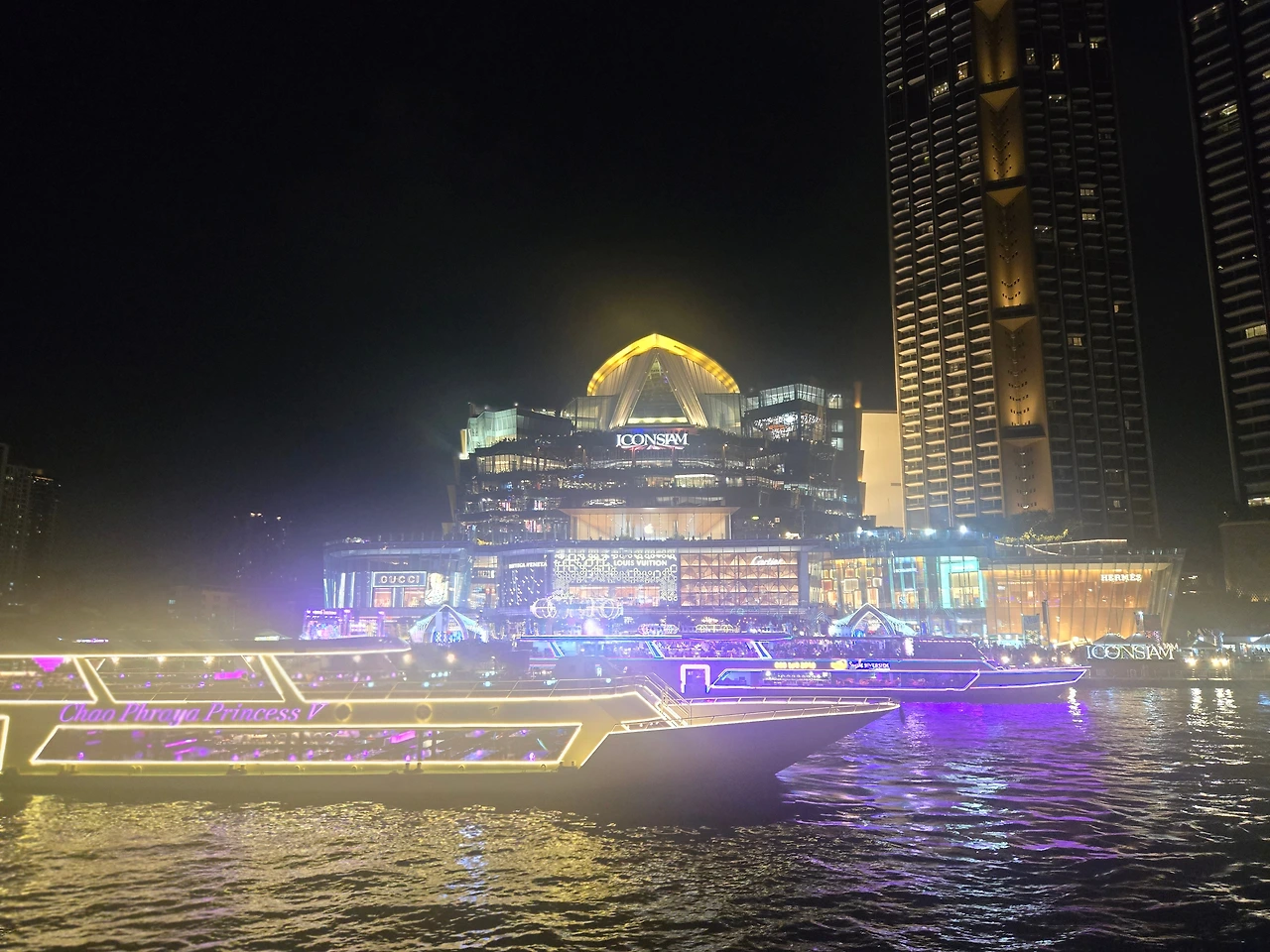 그런데 그 모든 수고가 무색할 만큼 크루즈는 상상 이상으로 아름다웠다. 찬란하게 반짝이는 짠내 어린 강바람 위에서 우리는 정성스레 준비된 저녁을 즐기며 방콕의 밤을 천천히 흘러갔다. 특히, 아이콘 시암에서 펼쳐지는 웅장한 물쇼, 강가를 배경으로 펼쳐진 태국 사원들의 실루엣, 그리고 송크란을 기념한 드론쇼까지 마치 한 편의 공연을 보는 듯한 밤이었다.