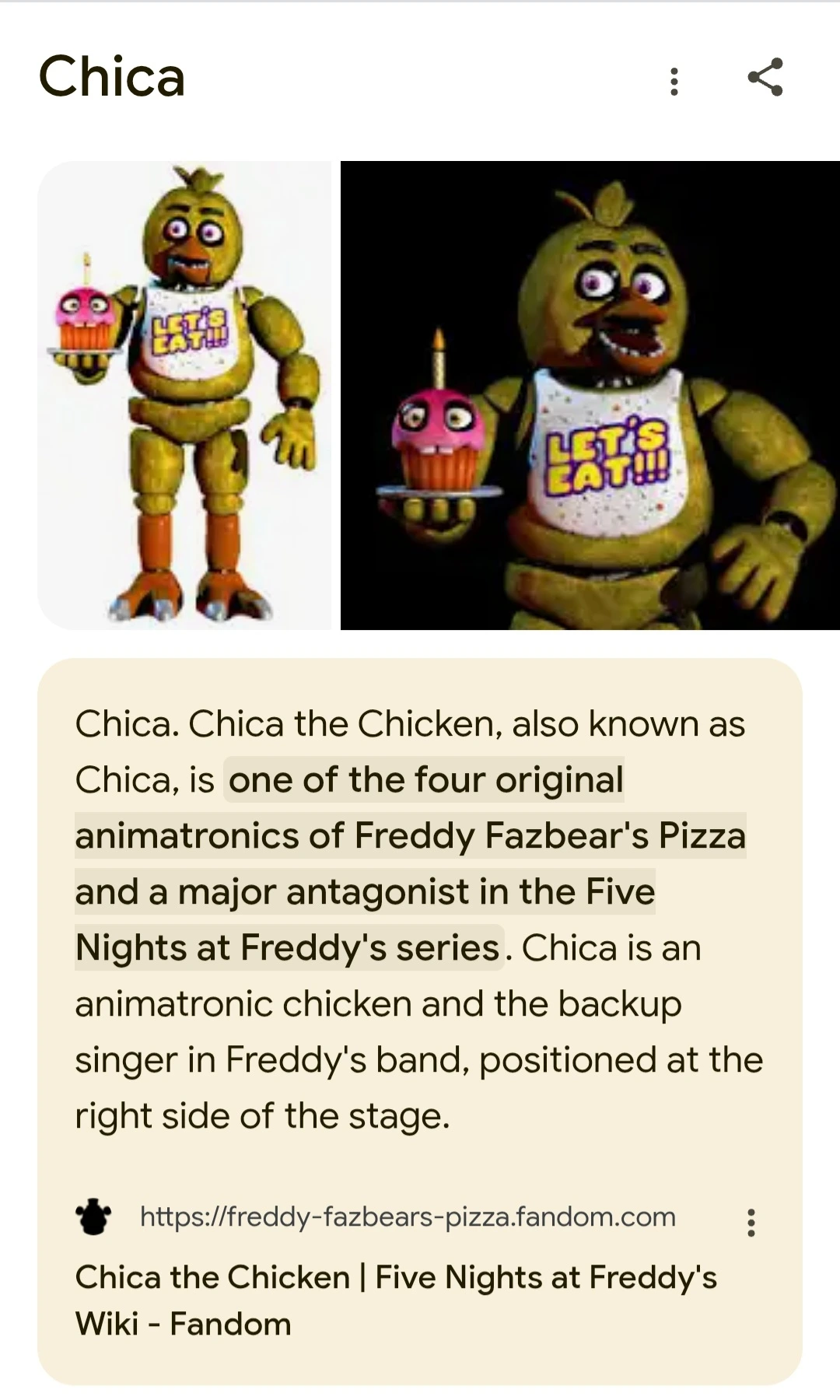 “사실은… Five Nights at Freddy's에 나오는 ‘치카 더 치킨’에서 따온 이름이야.”