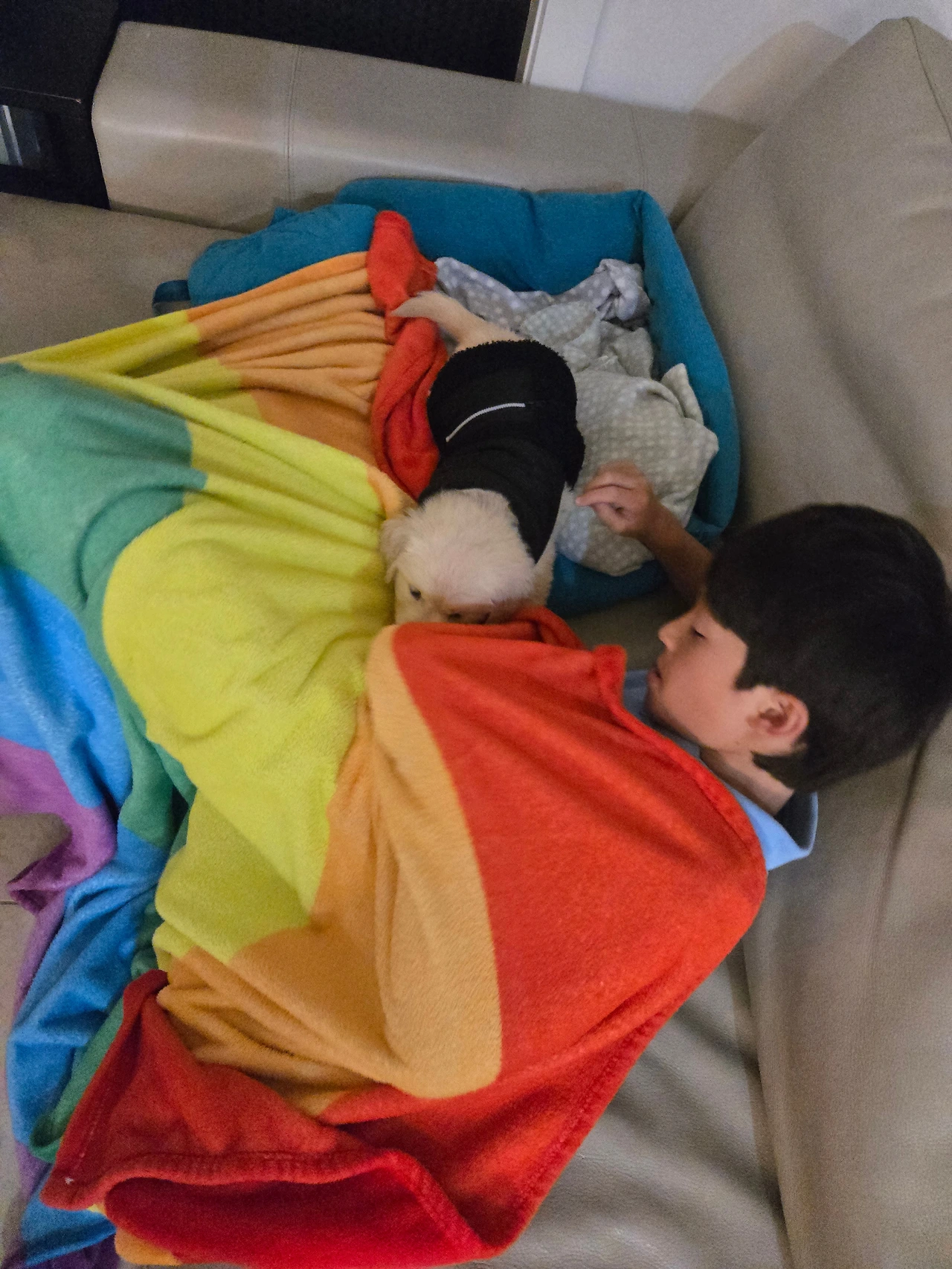 나는 조심스럽게 아이의 등을 토닥이며 말했다. “아빠는 출근을 해야 하고 조금 더 자고 있으면 소피아가 올 거야 걱정하지 마.” 그래도 아이는 그 자리를 쉽게 떠나지 않았다. 나는 결국 아이를 조심스럽게 안아 침대에 눕히고, 이불을 덮어주었다. 혼자는 무서워하는 것 같아서 치카를 행복이 옆에 두었다. 치카가 행복이의 손을 핥으며 함께 누웠고, 그렇게 아이는 잠시 눈을 감았다.
