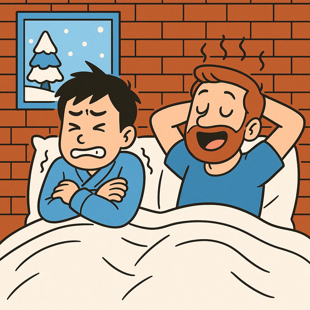 스티븐은 몸에 열이 많은 사람이다. 같은 이불을 덮고 자는데도 나는 몸이 오들오들 떨릴 정도로 춥고, 그는 더워서 이불을 걷어찬다. 나는 조금 더 따뜻하게 자고 싶고, 그는 조금 더 차갑게 자고 싶다. 이 차이는 생각보다 조율이 어렵다. 히터를 켜면 나는 겨우 살겠는데 스티븐은 땀을 흘리고, 창문을 열면 스티븐은 상쾌해하지만 나는 코끝이 얼어붙는다.