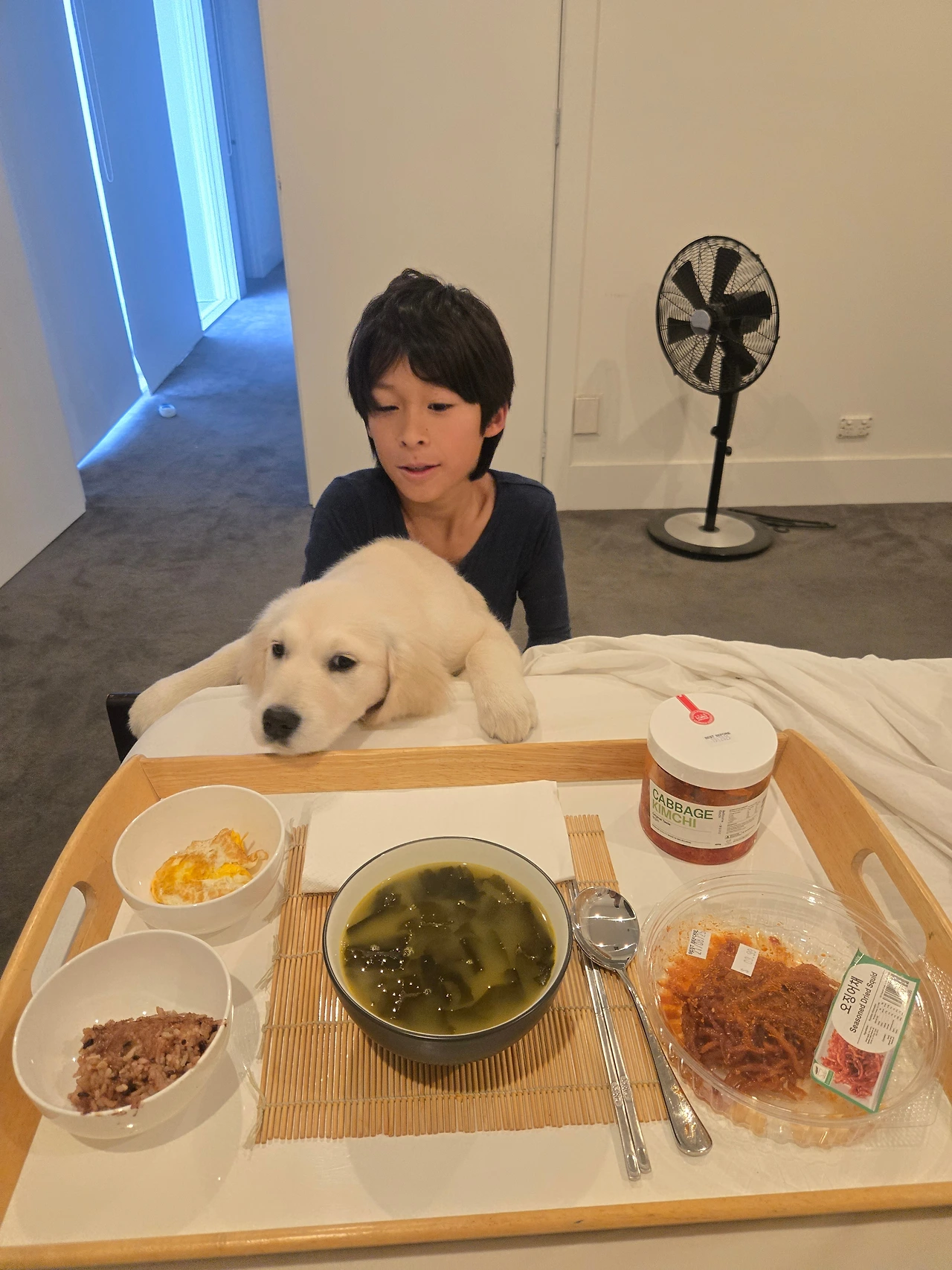 그리고 한 시간쯤 뒤, 행복이가 쟁반에 뭔가를 담아 조심스레 걸어왔다. 작은 밥그릇, 컵 하나, 접시 하나 어른 눈엔 엉성한 생일상이지만, 내겐 세상에서 가장 따뜻한 아침 식사였다.