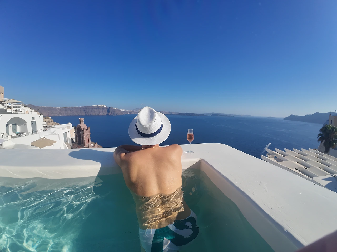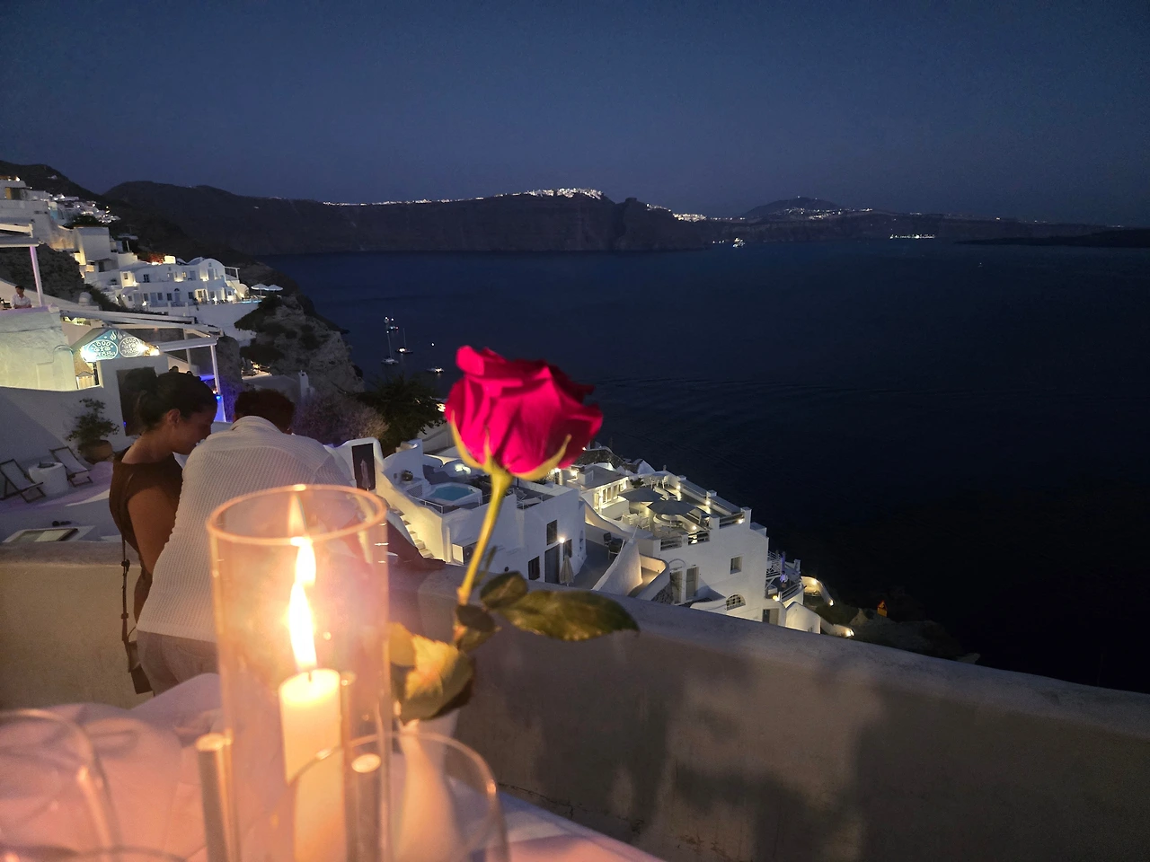 하지만 도착하자마자 정신이 하나도 없었다. 좁은 골목마다 인파가 가득했고, 공항에서 이동해 준 우버 기사마저 우리를 정확한 장소가 아닌 거리 한쪽에 내려다 주었다. 당황한 채 기다리던 우리 앞에 숙소 직원이 나타나, 직접 짐을 들고 좁고 복잡한 골목길을 안내해 주었다. 자동차가 들어갈 수 없는 장소였다. 그렇게 해서 우리는 평생 기억에 남을 숙소에 도착했다. 하루 숙박료가 약 백만 원. 결코 저렴하지 않았지만, 그 가치는 충분히 했다. 창밖으로 펼쳐진 에게 해의 풍경은 값으로 환산할 수 없는 것이었다.