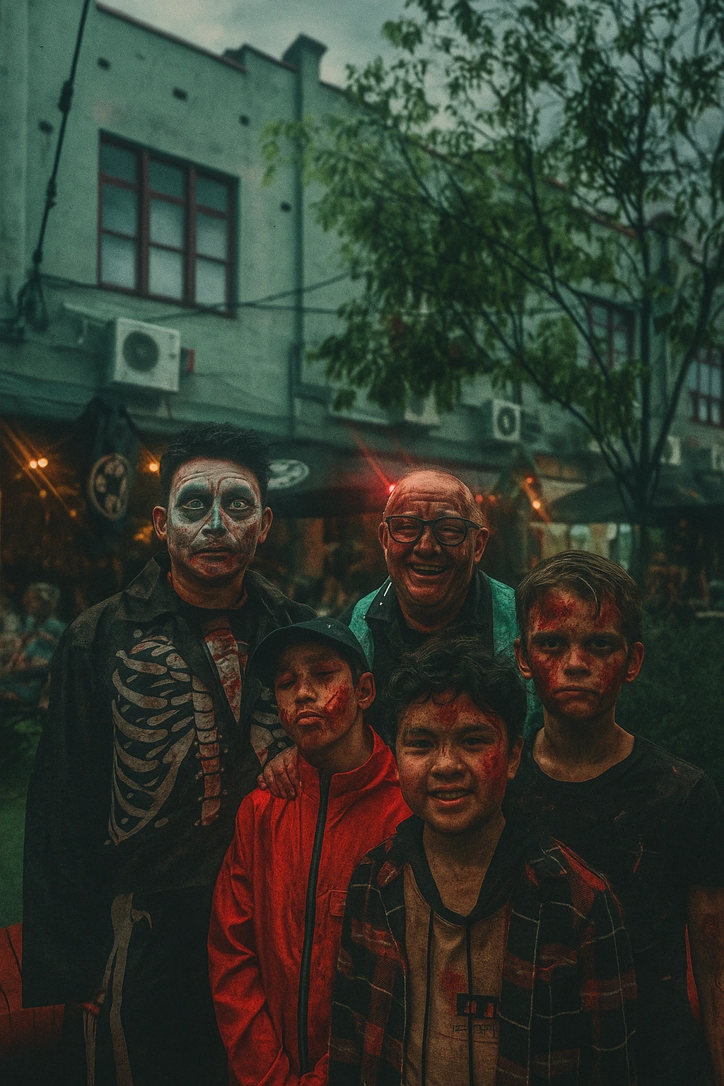 거울 앞에서 네 명이 서 있는 모습이 꽤 웃겼다. 평소에는 평범한 가족인데, 오늘만큼은 작은 영화 세트장 같았다. 거리에는 이미 아이들의 웃음소리와 “트릭 오어 트릿!” 외침이 울려 퍼졌다.