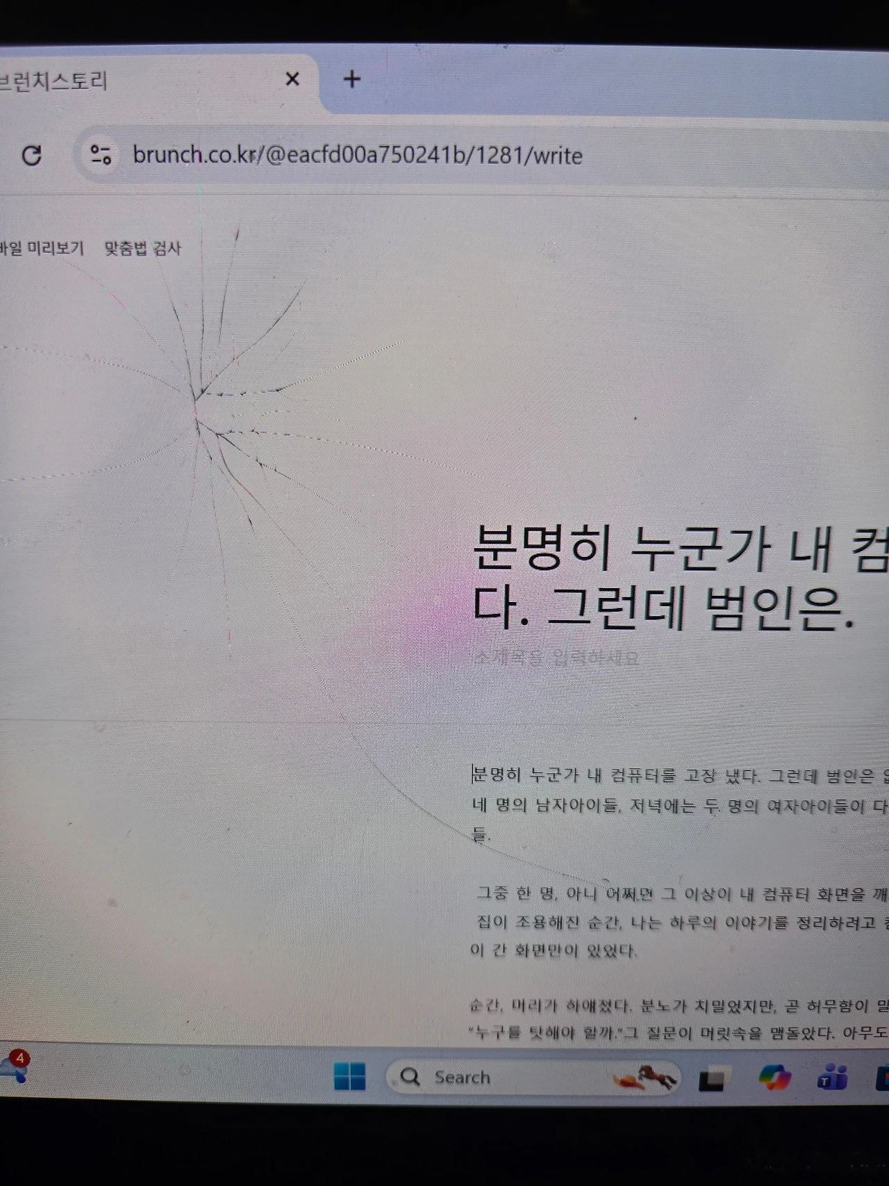 그중 한 명, 아니 어쩌면 그 이상이 내 컴퓨터 화면을 깨뜨렸다. 밤 9시, 모든 아이들이 돌아가고 집이 조용해진 순간, 나는 하루의 이야기를 정리하려고 컴퓨터를 열었다. 하지만 그곳엔, 산산이 금이 간 화면만이 있었다.