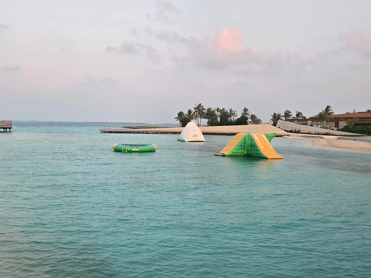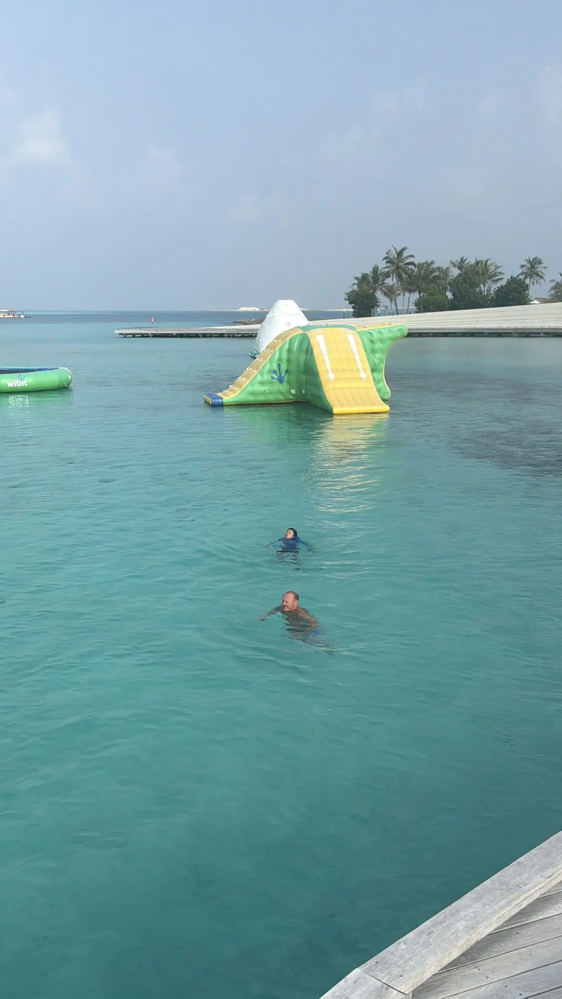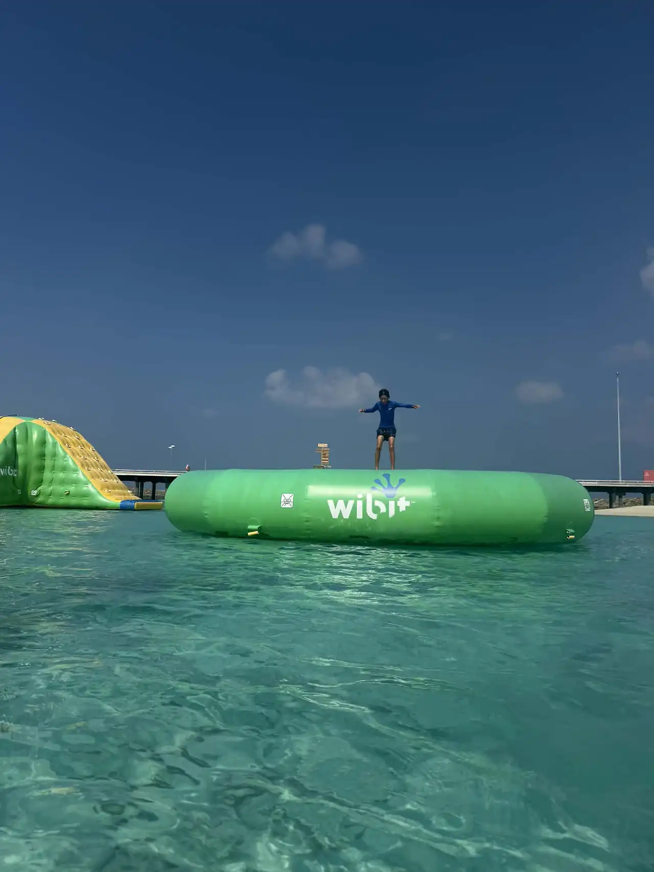 오늘 나는 정말 죽다 살아났다. 행복이가 워터 플레이를 하고 싶다고 했다. 그래서 우리는 수영장에서 바다 쪽에 설치된 워터플레이 구역으로 갔다. 그곳에는 세 가지 놀이기구가 떠 있었다. 첫 번째는 워터 트램펄린이었다. 수영해서 도착할 수 있는 거리였고 처음에는 크게 어렵지 않아 보였다. 행복이와 나는 첫 번째 놀이기구 위에서 즐거운 시간을 보냈다.