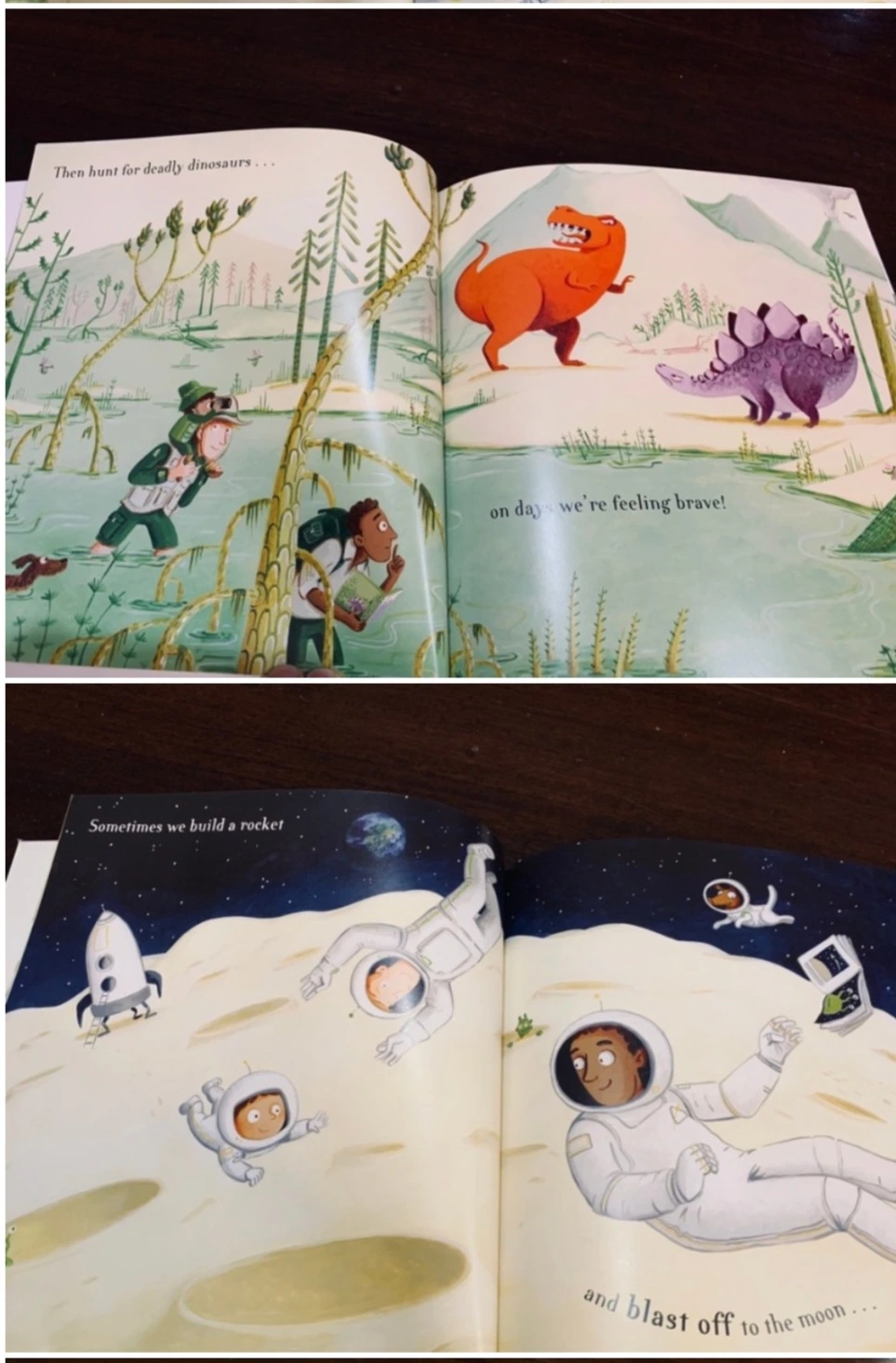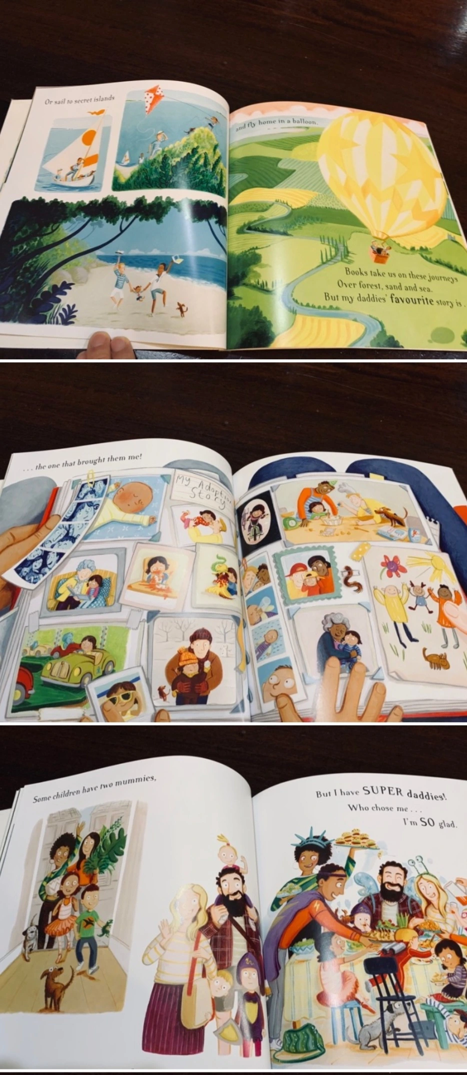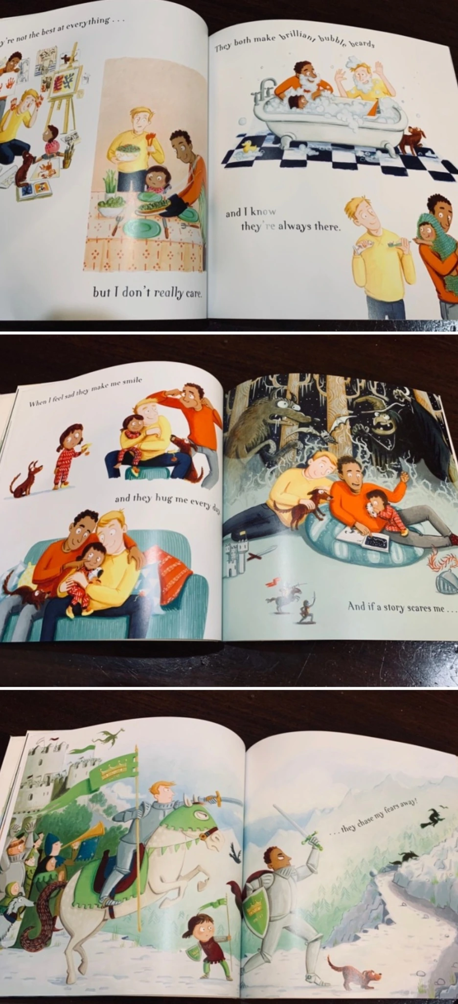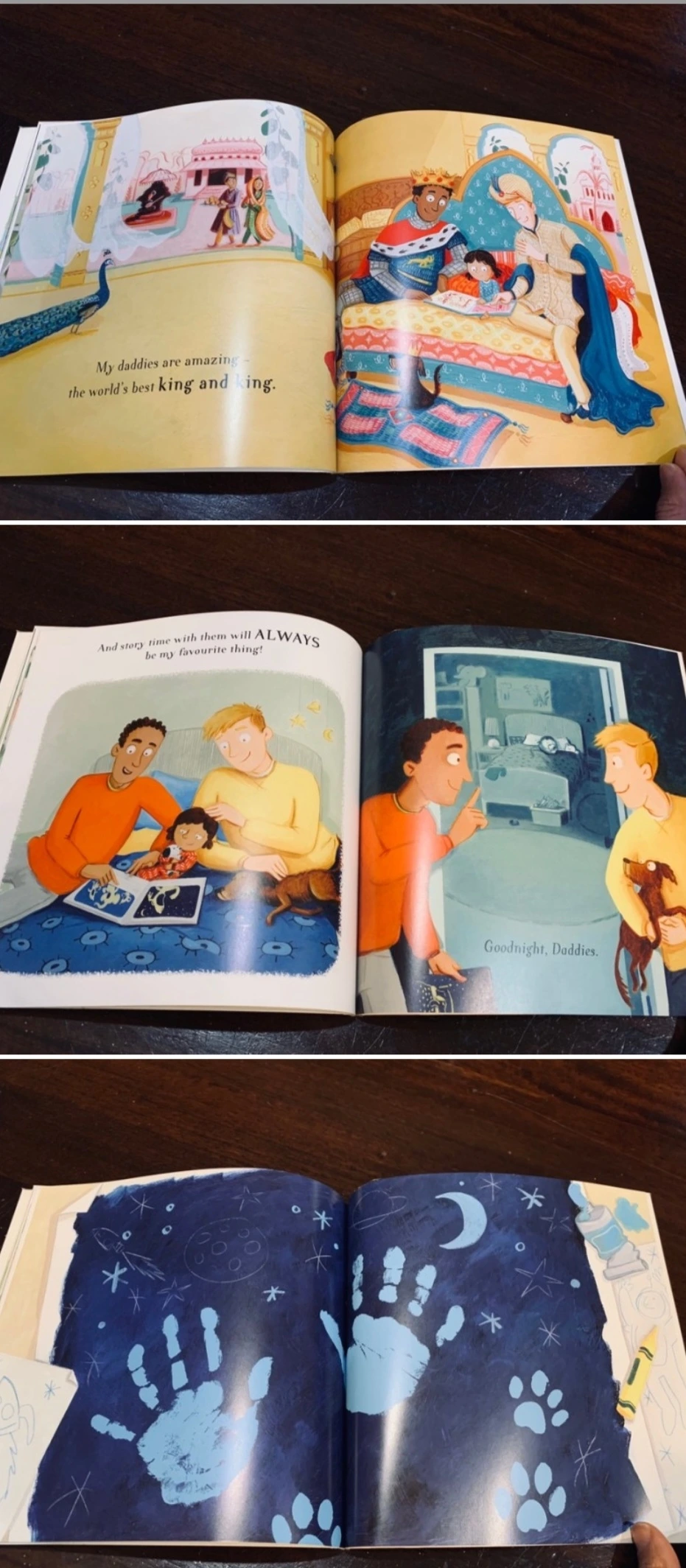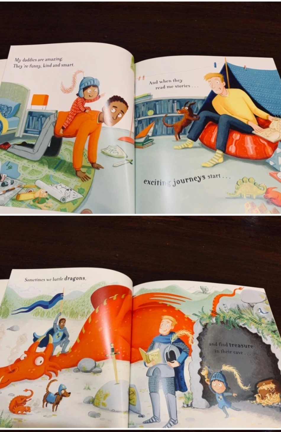 “오늘날 세상에 존재하는 다양한 종류의 가족들을 아이들에게 소개하기 좋은 책이다. 사랑스러운 게이 아빠들과 딸이 함께 하는 다채로운 삶을 읽을 수 있다. 책을 읽기 시작하면 그들의 모험이 시작되는데 용과 싸우고, 치명적인 공룡을 피하고, 달에서 뛰어놀고 그들은 세계를 탐험한다. 이 책은 통통 뛰고, 리듬감이 있고, 읽기 쉬운 텍스트로 되어있다.”