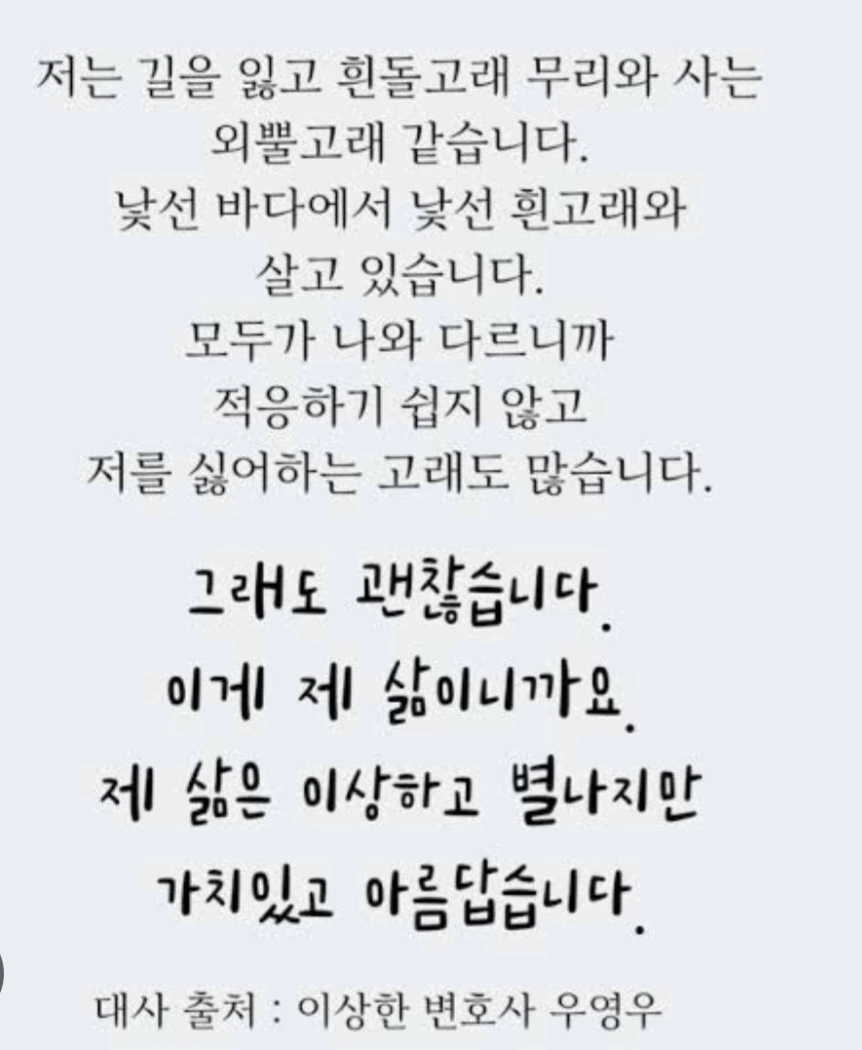 제가 누구인지, 어떤 삶을 살고자 하는지를 세상에 대놓고 말하는 것은 두려움을 이겨내는 과정이었습니다. 그러나 그 과정 속에서 저는 참된 자신을 찾아냈고, 그 자신을 사랑하는 법을 배웠습니다. 그래서 저는 괜찮습니다. 이것이 바로 저의 삶이기 때문입니다.