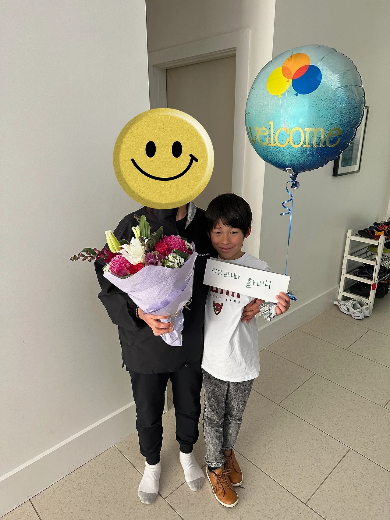 우리는 우버를 호출하여 멜버른 집으로 갔습니다. 집 앞에 도착하자마자 문이 열렸고, 안에서는 기다리고 있던 행복이가 환영의 의미로 만든 플래카드를 들고 나왔습니다. 플래카드에는 '환영합니다. 할머니'라는 문구가 한글로 적혀있었고, 한 손에 Welcome이라고 적힌 풍선을 들고 있었습니다. 행복이는 그 플래카드와 풍선을 들고 할머니에게 달려가며 환한 미소로 반겼습니다. 그리고 스티븐이 꽃다발을 엄마에게 건네주었습니다.