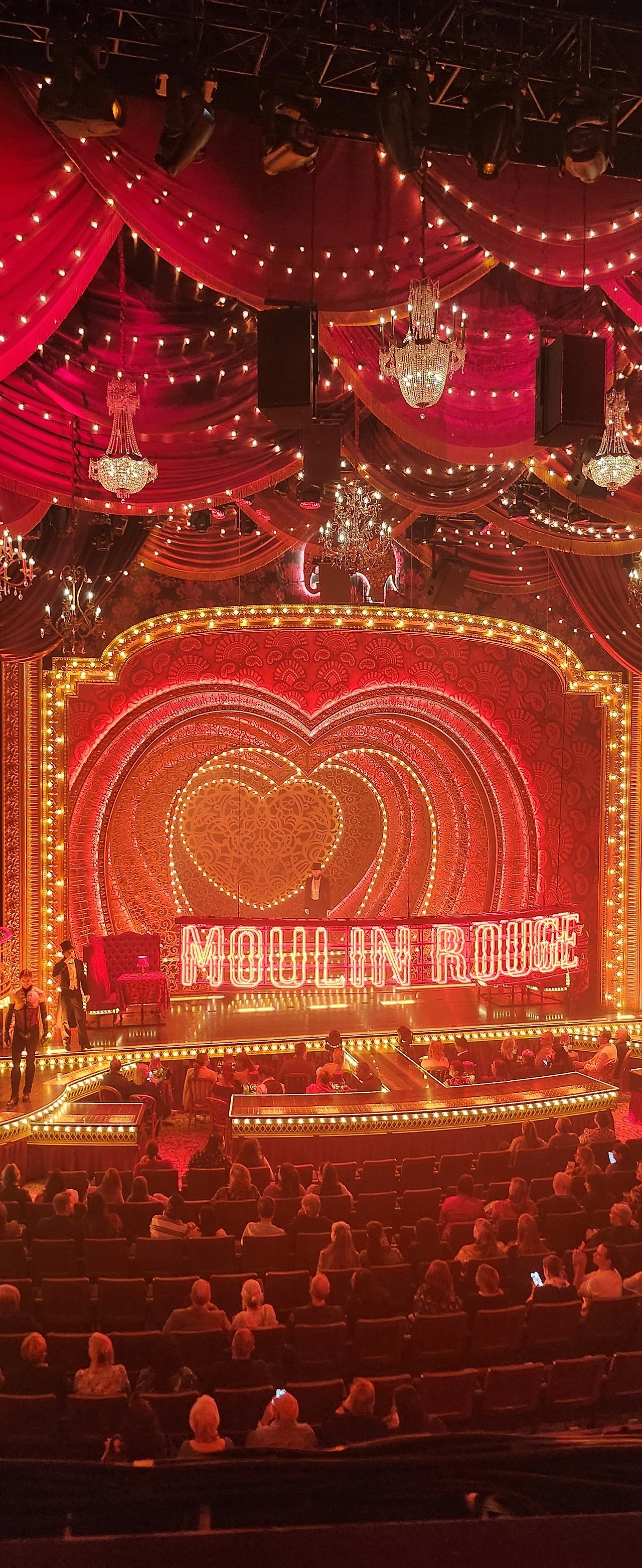 식사가 끝나고 뮤지컬 '물랑 루즈'를 보기 위해 극장으로 발걸음을 옮겼다. 시티의 극장가로 향하며 햇살이 저물어가는 거리의 분위기가 낭만적이었다. 저녁은 자주 먹지만 뮤지컬까지 함께 보니 더 로맨틱한 기분이 들었다. 극장 앞에 도착했을 때, 아직 시작하기엔 시간이 좀 남았음에도 불구하고 이미 수많은 관객들이 극장 앞에서 대화하며 기다리고 있었다.