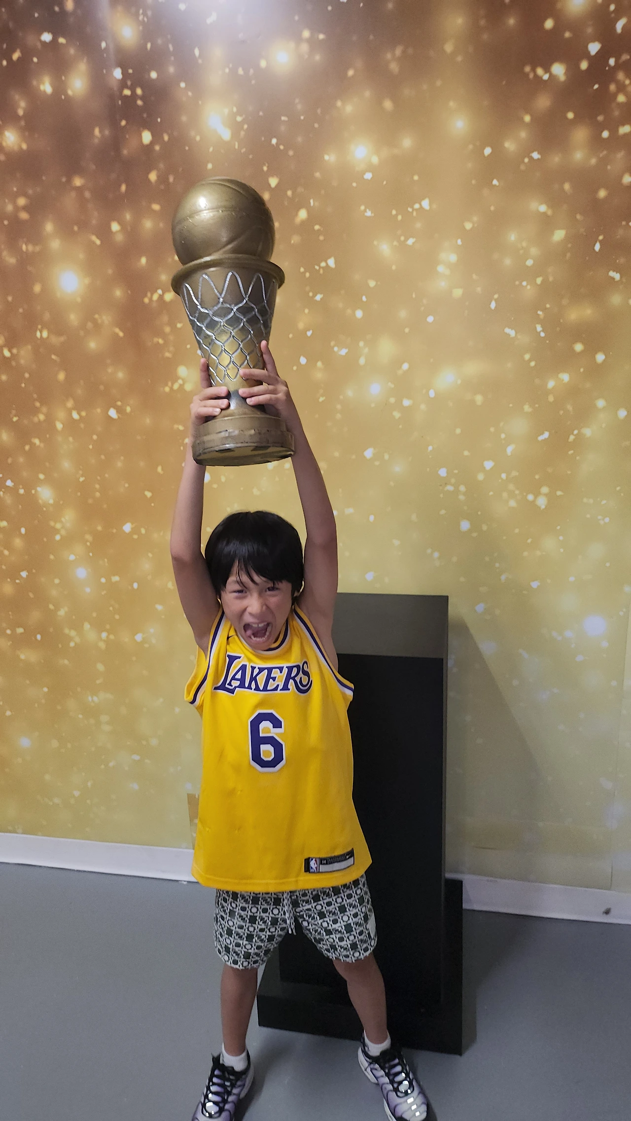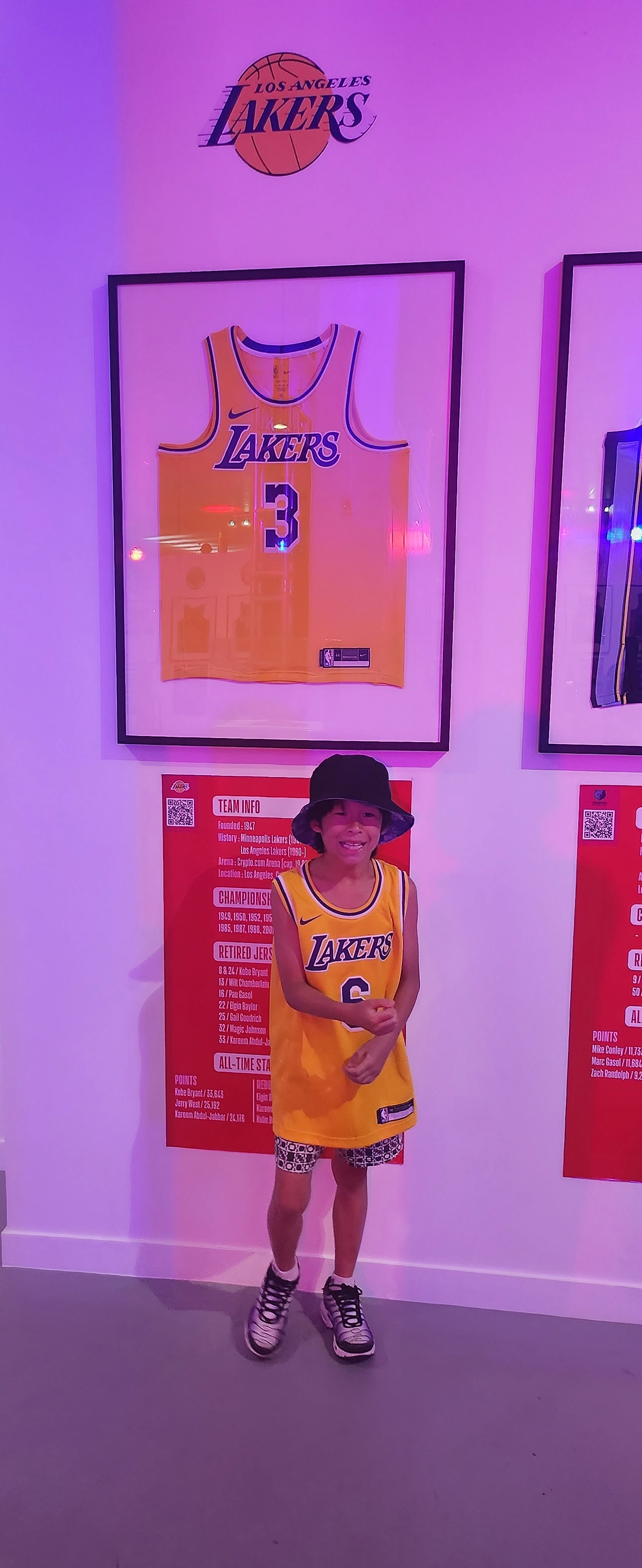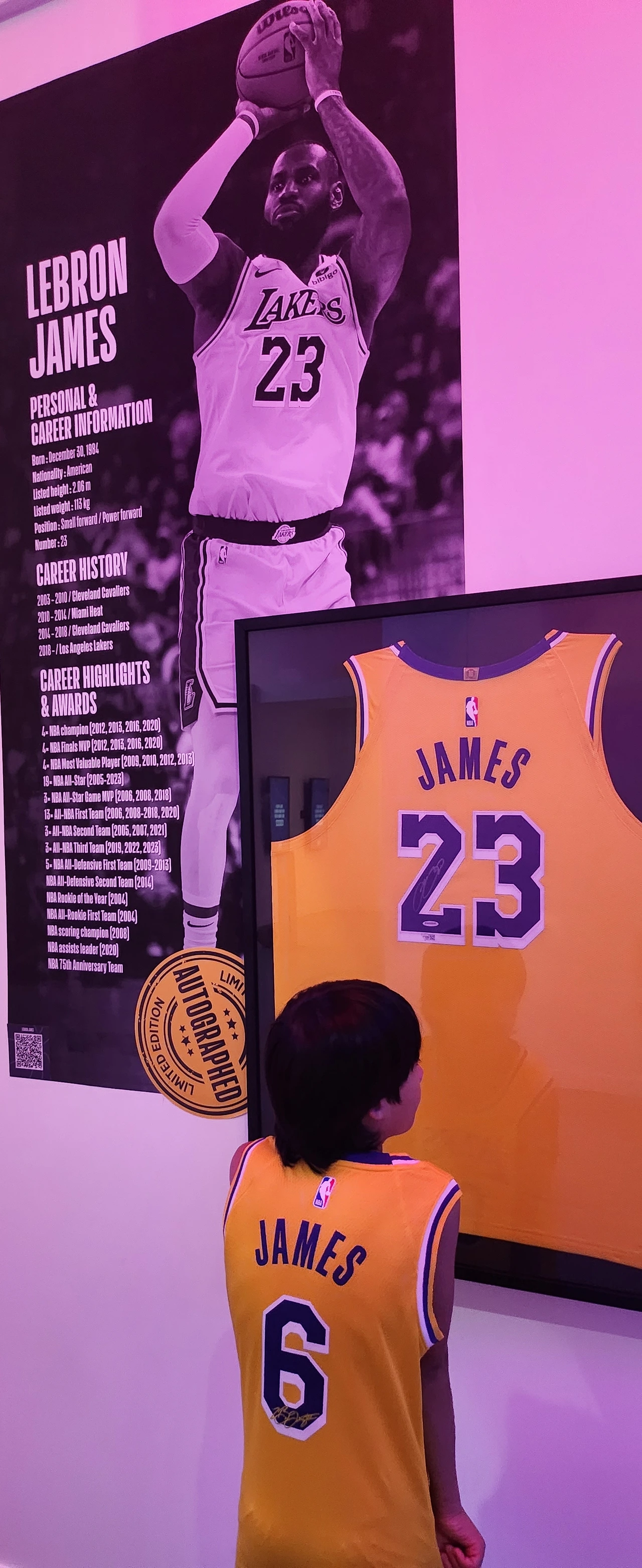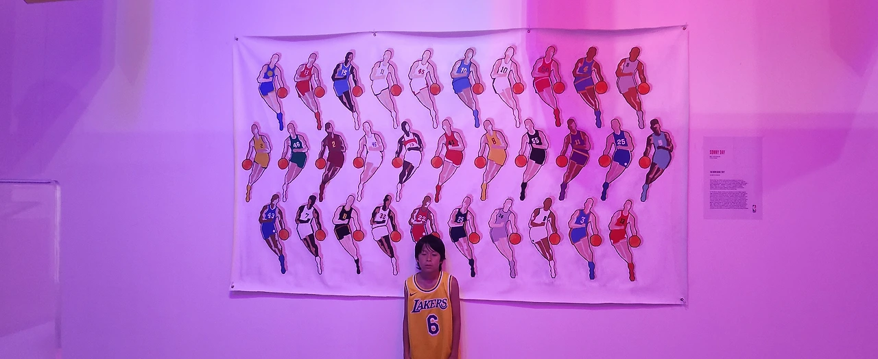 2시에 전시를 보기 위해 예약을 해놓았기 때문에, 우리는 근처에서 간단히 점심을 먹고 전시장 안으로 들어갔습니다. 전시장에 들어서자마자, 르브론 제임스의 대형 사진이 우리를 맞이했습니다. 그 순간, 저는 어린 시절 시카고 불스의 마이클 조던을 생각했습니다. 제가 어렸을 때는 마이클 조던이 최고의 선수였지만, 요즘에는 LA 레이커스에서 뛰는 르브론 제임스가 엄청난 명성을 가진 선수가 되었죠.
