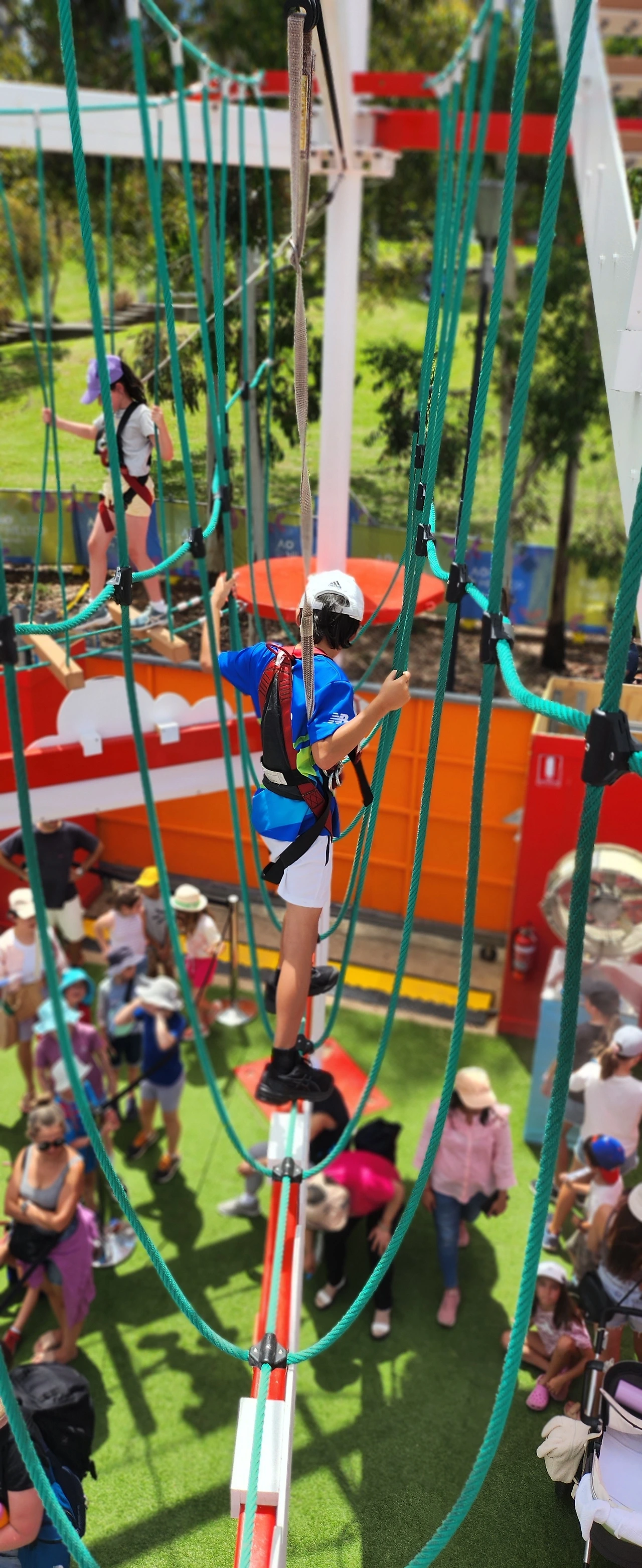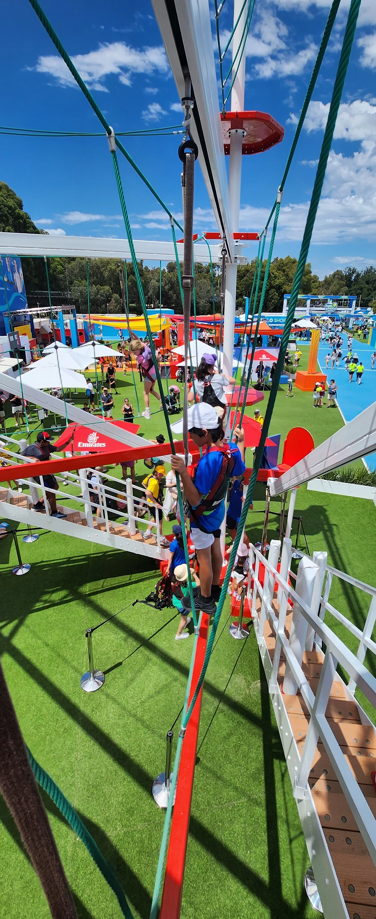 아들과 함께 경기장을 둘러보다가, 아이들을 위해 특별히 마련된 'Ballpark'라는 장소에 들렀습니다. 이곳에서는 다양한 액티비티가 준비되어 있었고, 특히 외줄 타기 같은 코스가 눈에 띄었습니다. 행복이와 함께 한 시간 이상 줄을 서서 기다렸고, 마침내 저도 도전하기로 결심했습니다. 아무 생각 없이 도전한 이번 외줄 타기 코스에서의 경험은 저에게 많은 것을 깨닫게 해 주었습니다.
