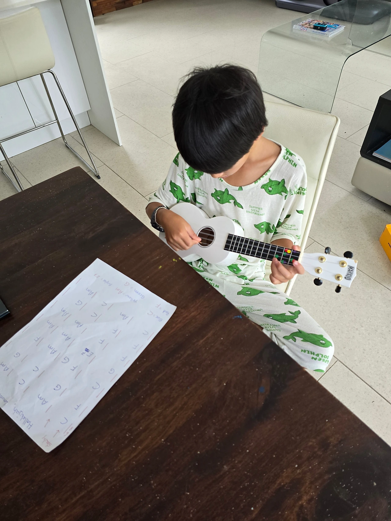우리의 매일 5분 연습은 단순한 악기 연습을 넘어서, 부모와 자녀가 함께 시간을 보내며 서로를 더 깊이 이해하고 소통하는 소중한 순간이 되고 있습니다. 우쿨렐레의 달콤한 멜로디가 우리 집안을 가득 채우며, 행복이의 음악 여정은 점점 더 풍성해져만 갑니다. 그의 새로운 도전이 어떤 아름다운 결과를 가져올지, 저는 기대로 가득 차 있습니다.