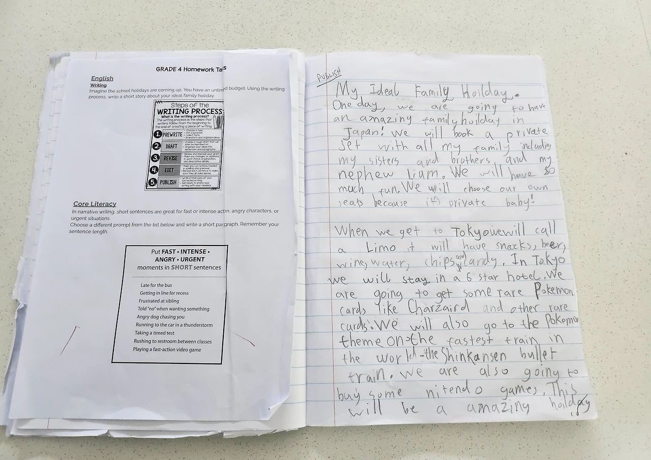 주말에 행복이의 숙제를 도와주었습니다. 숙제가 미래에 가는 가족 여행에 대해 쓰는 것이었는데, 정말 힘들게 겨우 끝낼 수 있었습니다. 올해 10월에 일본과 한국 여행을 계획하고 있어서 숙제가 조금 수월할 것이라 생각했지만, 행복이에게는 아직 일어나지 않은 일에 대해 상상해서 쓰는 것이 쉽지 않은 과제였습니다. 그래서 함께 앉아서 행복이의 상상력을 자극해 주며 도움을 주었는데, 그렇게 겨우 숙제를 마무리할 수 있었습니다.