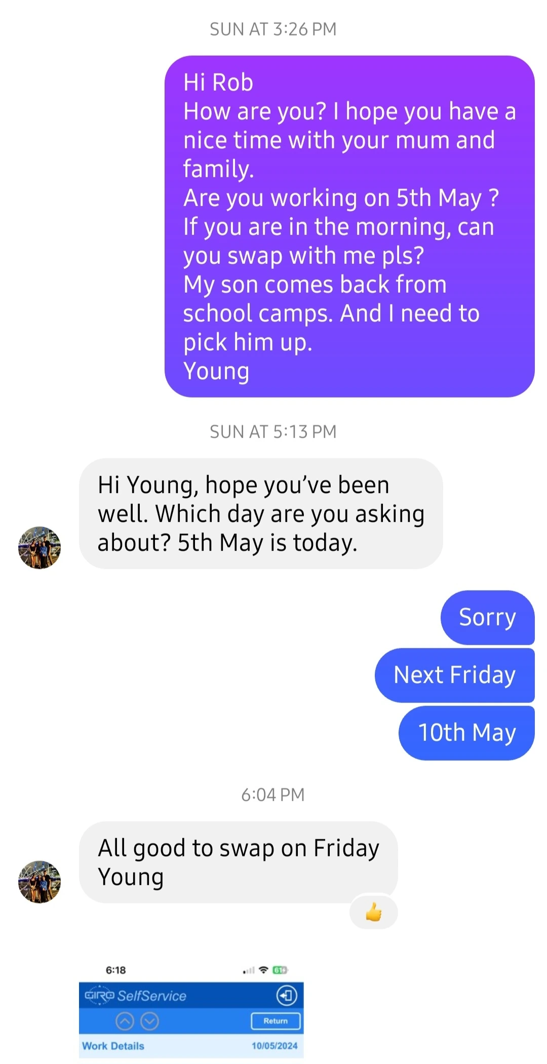 갑자기 스티븐이 내일 해외 출장을 가게 되어 근무를 변경해야 하는데, 생각보다 쉽지 않았습니다. 다행히 과거에 새벽 근무자들을 도와준 경험이 있어서 그들에게 근무 변경을 부탁해 보았습니다. 운 좋게도 한 분이 저와 근무를 바꿔주셨습니다. 덕분에 금요일에 행복이가 학교 캠프에서 돌아오는 날에 아들을 픽업할 수 있게 되었습니다. 이 경험을 통해 서로 돕고 배려하는 것이 얼마나 중요한지 다시 한번 깨달았습니다. 특히 직장에서는 신뢰를 쌓고 서로 지원하는 것이 많은 도움이 된다는 것을 느꼈습니다.
