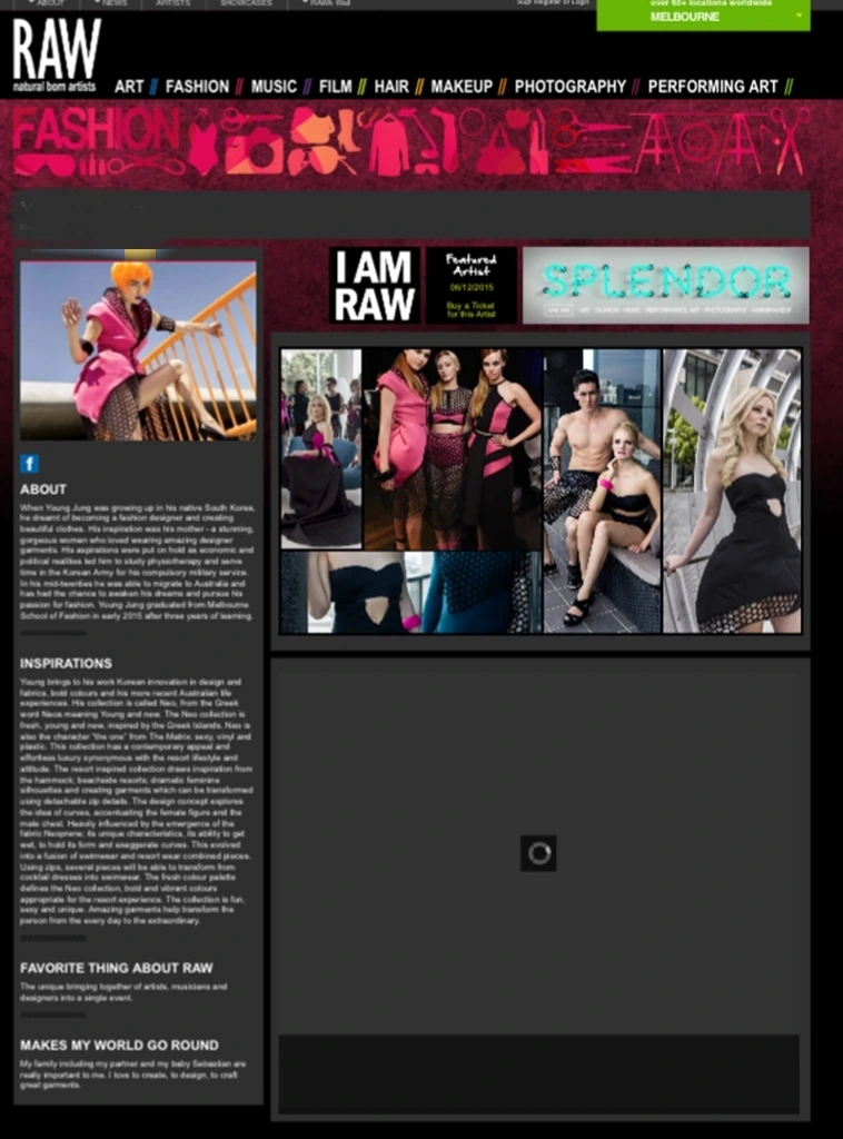 오늘은 오랜만에 내 패션쇼를 하는 날이다. RAW(natural born artists)에서 주최하는 쇼에 초대를 받았다. RAW은 시각 예술, 영화, 패션 및 액세서리 디자인, 음악, 공연예술, 미용, 공예, 사진 분야의 독립적인 재능을 조명한다. 크리에이티브가 자신의 지역 커뮤니티와 전 세계에 선보일 수 있는 가장 재미있고 대안적인 방법으로 '우리는 평범한 예술 쇼가 아니다.' 라는 것을 마음껏 드러내고 RAW는 기분좋은 시끄러운 활기와 다채로움과 넘치는 창의력이 함께한다.