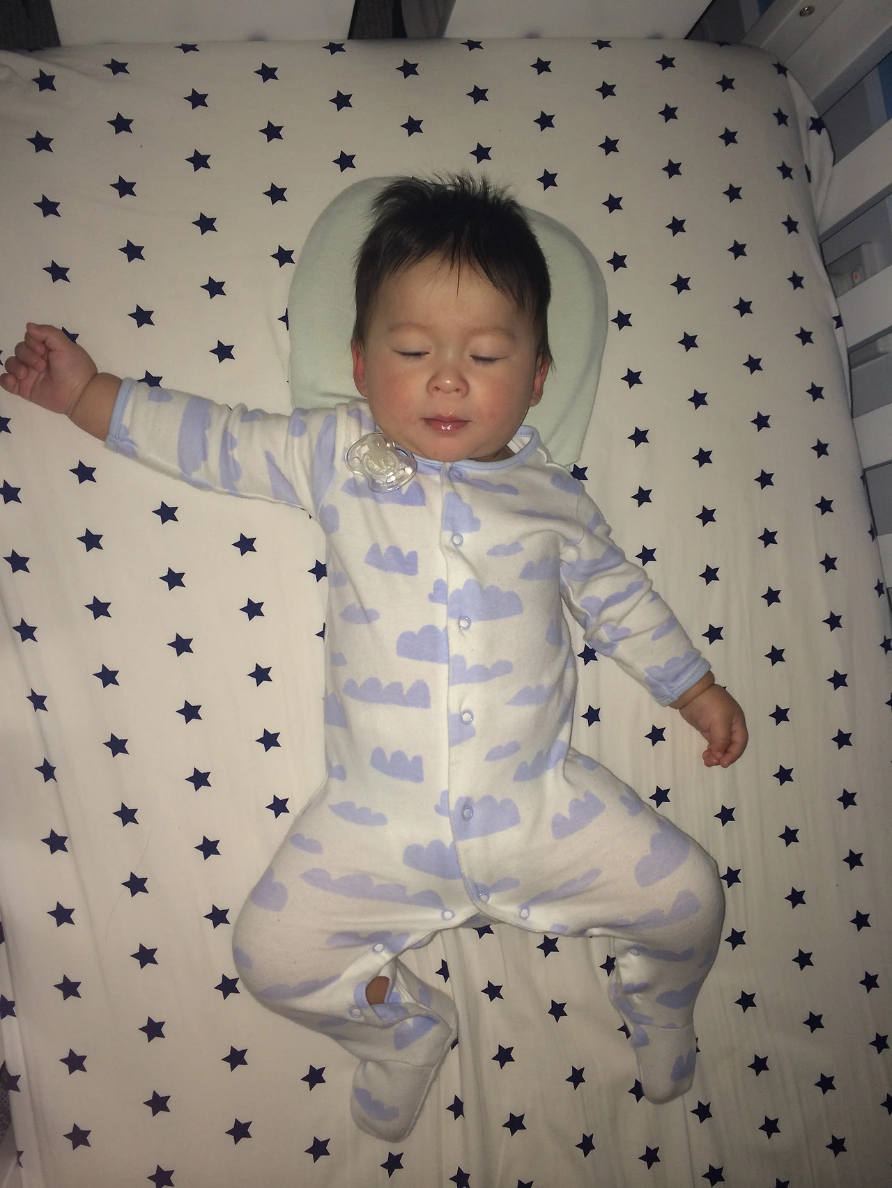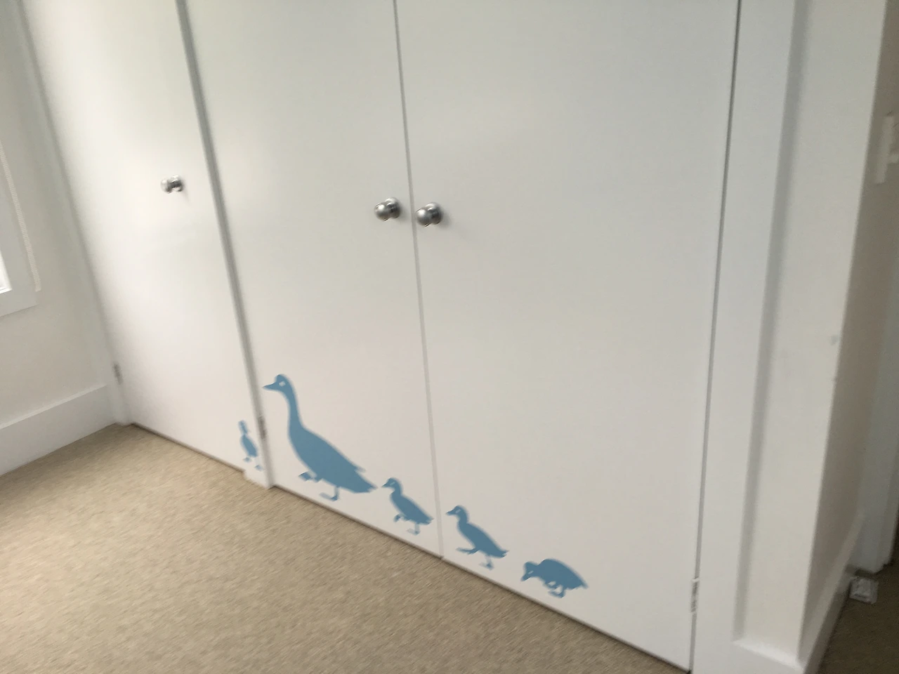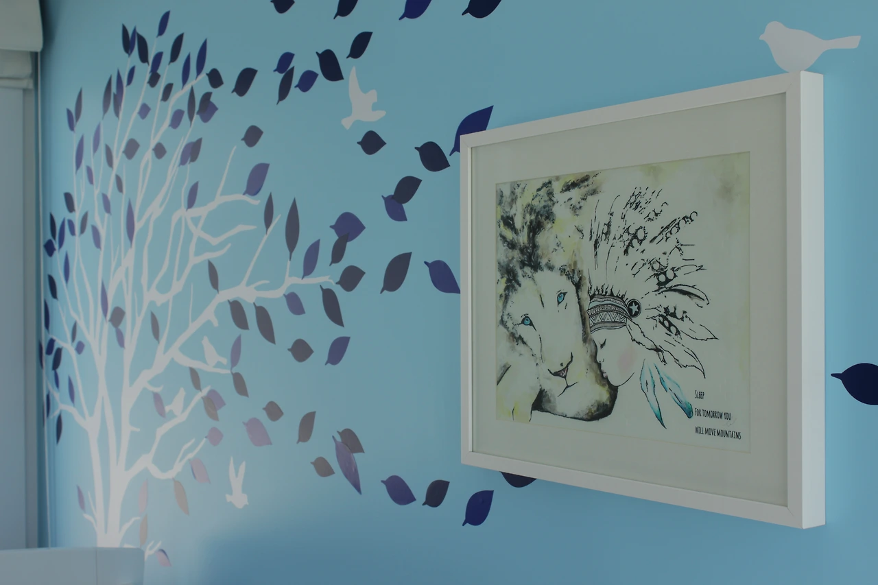 일단 잠자기 전 기본적인 루틴을 따라서 목욕을 시키고 방에 들어가 침대에 행복이를 눕히고 수면 등을 켜 놓고 책을 읽어준다. 그리고 태어나서 지금까지 한번 도 빼먹은 적이 없는 수면 유도 클래식을 틀어 준다. 행복이의 방은 차분하고 안정감을 주기 위해 나와 스티븐은 며칠을 고민해서 아이디어를 수집해서 또 며칠에 걸려서 페인트칠하고 장식했다. 베이스 컬러는 화이트칼라로 심플하게 하고 아기방이기에 최대한 따뜻하고 차분하게 꾸미기 위해 한쪽 벽면은 블루로 포인트를 주었다. 블루 벽면에 나무 모양과 새 모양의 포스트를 붙여주면 인테리어 효과가 좋아 아기자기한 느낌이 들게 만들었다.