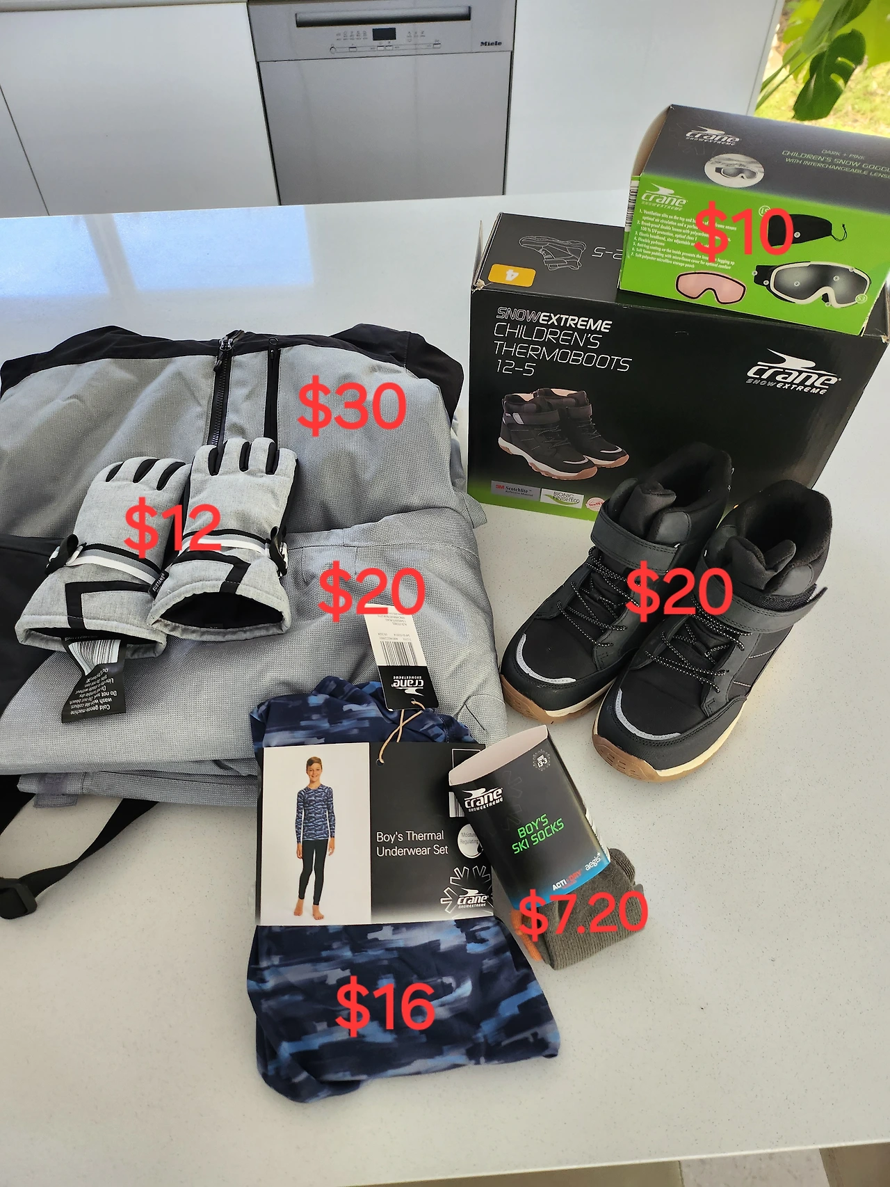 그런데 제가 왜 힘들게 발품을 팔며 5곳이 넘는 ALDI 슈퍼를 돌아다녔는지 공개합니다. 행복이가 입고 있는 모든 것이 합쳐서 115.20불(한화로 약 10만 원)입니다. 처음 가는 여행이고, 스키복을 빌려서 사용하는 것보다 새것을 입히고 싶은 부모의 마음에 이리저리 돌아다녀서 완성된 행복이의 스키 여행 아웃핏입니다. 아들이 모든 것을 깔맞춤을 하고 싶다고 해서 전부 깔맞춤을 해주었습니다. 힘은 들지만 아들을 위해서 최선을 다했습니다.