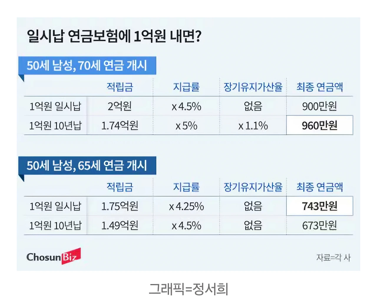 계속해서 보험에 대해 공부하다 보니, 일시불로 연금을 넣는 제도도 있다는 것을 알게 되었습니다. 이를 통해 조금 더 마음의 여유가 생기긴 했습니다만, 여전히 현실적으로 노후 준비에 대한 고민은 깊어집니다. 저는 계획 세우기를 좋아하는 사람입니다. 그래서 행복이가 대학생이 될 때까지는 노후 준비를 잠시 미루고, 그 이후부터는 돈을 열심히 모아 1억 정도를 일시납 연금에 가입할 계획을 세우고 있습니다. 이렇게 하면 노후에 대한 대비가 조금은 더 안정적일 것이라고 생각합니다.
