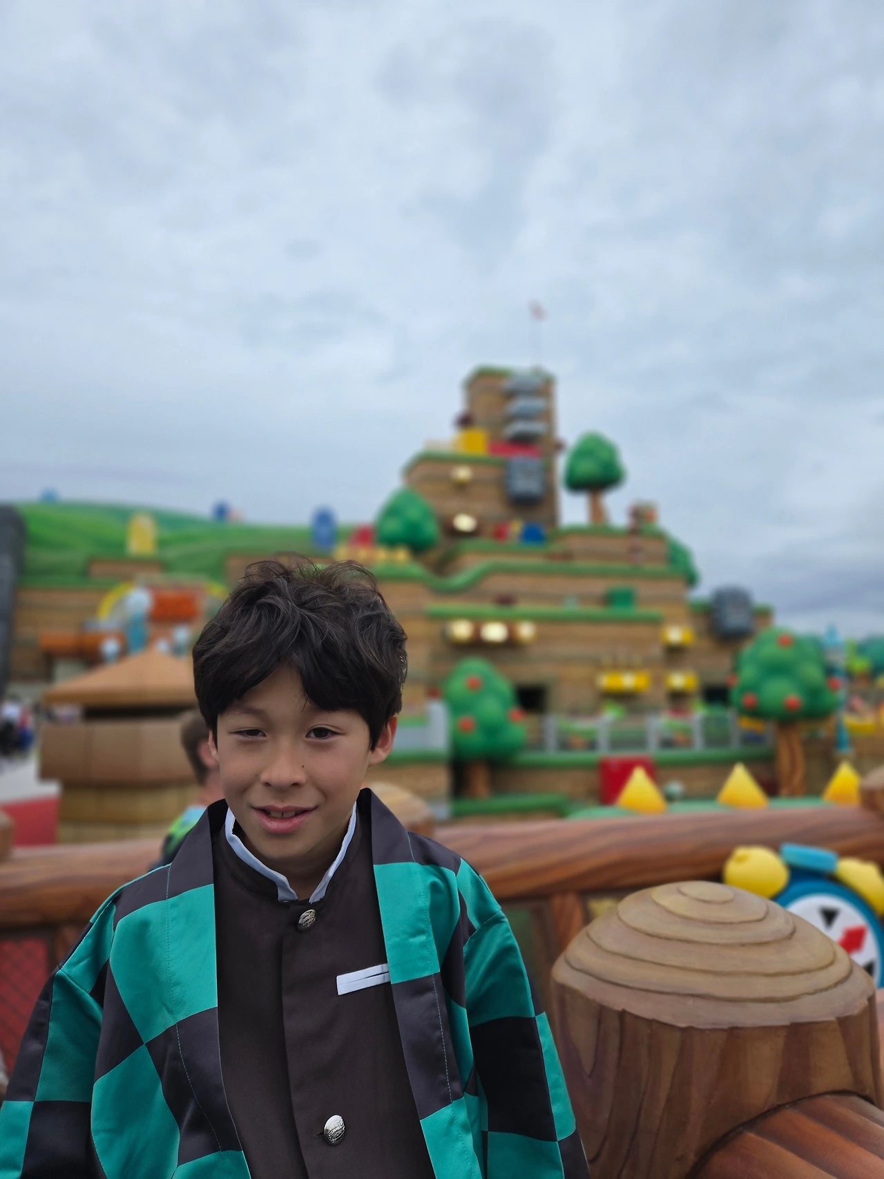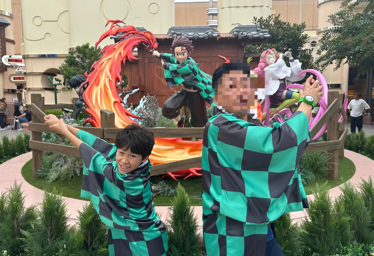 새벽6시에 먼저 일어나서 유니버설 스튜디오를 먼저 둘러보니 이미 많은 사람들이 줄을 서 있더군요. 공식 입장은 8시 30분이었지만, 날씨 때문에 7시 30분에 문을 열었습니다. 저희도 서둘러 입장해 행복이가 좋아하는 '데몬 슬레이어' 놀이기구를 타기 위해 달려갔지만, 1시간을 기다려야 했어요. 놀이기구를 타고나서 행복이가 제안한 것이 탄지로 의상을 맞춰 입고 다니자는 거였어요. 솔직히 100불짜리 의상이라 망설였지만, 좋은 아빠가 되자는 마음으로 함께 입었습니다. 유니버설 안 일본 사람들도 저희 부자의 커플룩을 보며 많이 좋아해 주었고, 그 순간은 정말 행복했어요. 일본 사람들은 정말 코스튬을 좋아하는 것 같습니다.