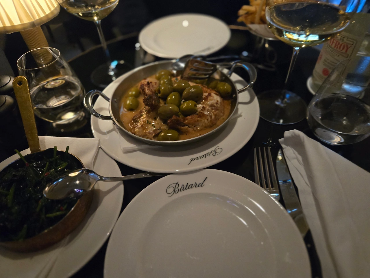 식전 요리로 등장한 전채는 시각적으로도 큰 만족감을 주었습니다. 바삭한 크루아상 위에 부드러운 크림과 신선한 해산물이 올려져 있었는데, 한 입 베어 물기 전부터 이미 그 정성스러운 디테일이 느껴졌습니다. 깨끗하게 관리된 흰색 접시가 전체적인 고급스러움을 더했습니다. 메인 요리는 더욱 눈길을 사로잡았습니다. 스테인리스 스틸 팬에 담긴 치킨에는 따뜻한 소스가 흐르고 있었고, 그 위에는 푸른 올리브가 풍성하게 올려져 있었습니다. 부드럽게 익은 고기와 짭짤하면서도 신선한 올리브의 조화는 입맛을 자극했고, 곁들여진 신선한 채소와 함께 완벽한 밸런스를 이루었습니다. 화이트 와인은 식사의 우아함을 완성해 주었습니다.