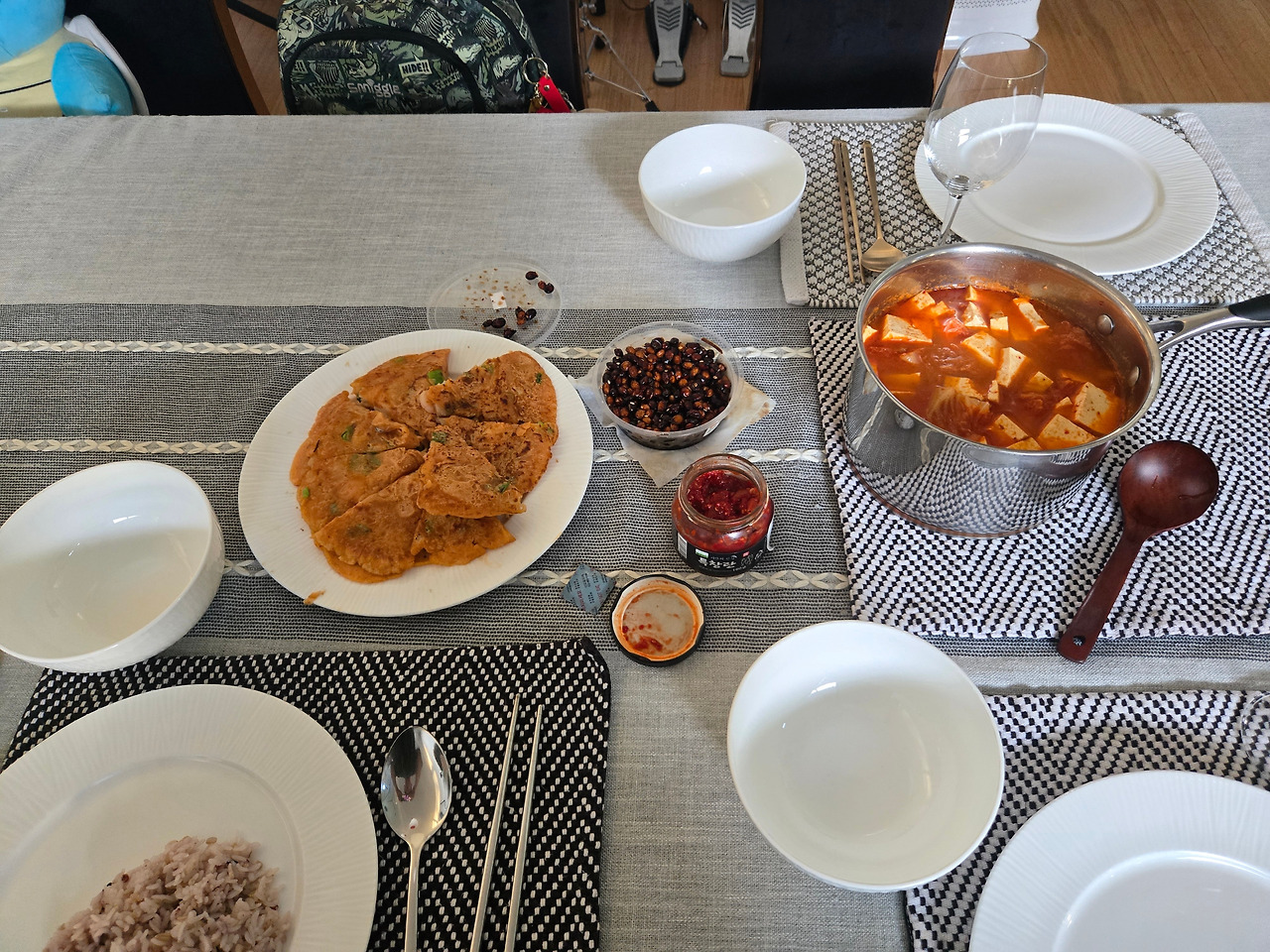 우리는 식탁에 둘러앉아 갓 부쳐낸 김치전과 김치찌개를 앞에 두고 식사를 시작했다. 김치전은 바삭바삭했고, 찌개는 얼큰하고 깊은 맛이 느껴졌다. 한 입 먹을 때마다 다들 감탄사가 절로 나왔다.