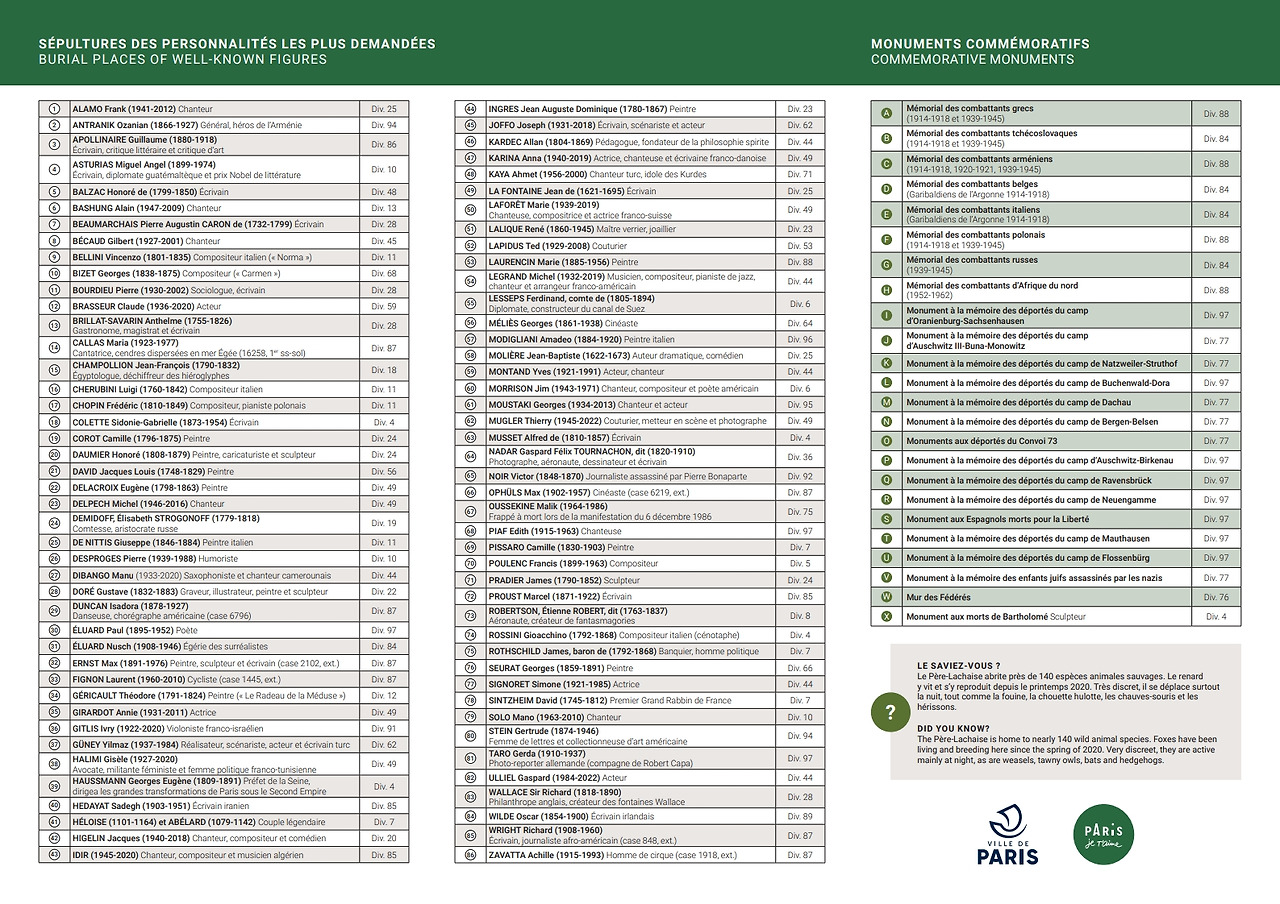 '뻬흐라셰즈'에서 묘비들 사이를 천천히 걷다 보면, 어느 이름 앞에서 발걸음이 멈춰진다. 쇼팽, 비제, 오스카 와일드, 마르셀 프루스트, 발자크, 기욤 아폴리네르, 에디트 피아프, 이브 몽땅, 짐 모리슨, 모딜리아니, 이사도라 던컨, 마리아 칼라스 등 그 외에도 누구나가 한 번쯤은 들어봤을 만한 많은 유명인들이 여기서 쉬고 있다.