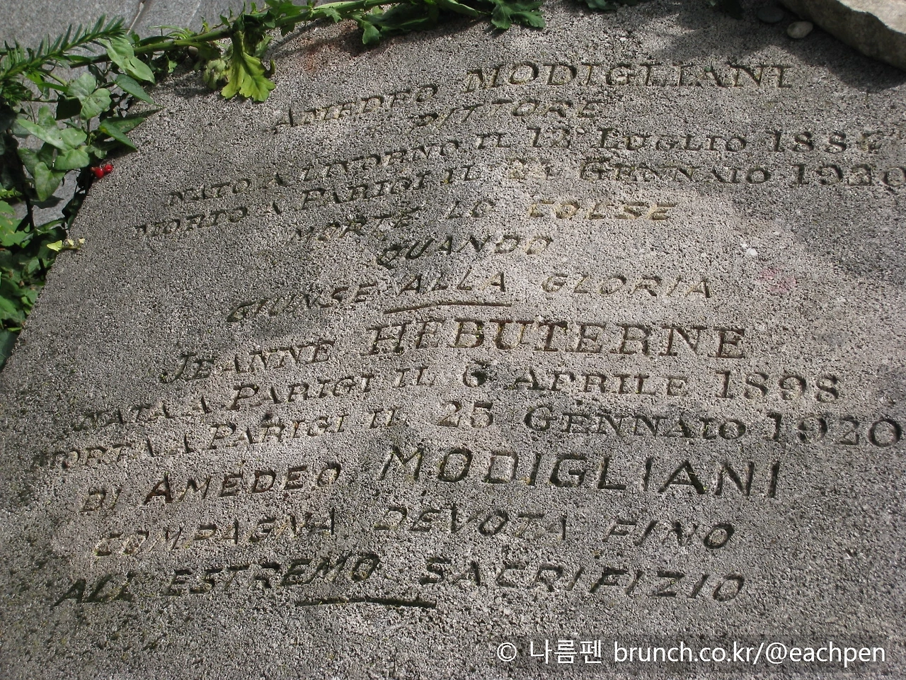 모딜리아니는 극심한 생활고와 만성 질환으로 평생 불우한 생을 살다가 36세에 생을 마감하고, 여기에 묻힌다. 그가 숨을 거두자, 그의 뮤즈이자 사실혼 배우자인 '잔느 에뷔테흔'(Jeanne Hébuterne, 1898~1920)은 비극적으로 그를 따라간다. 훗날 '잔느'가 뻬흐라셰즈의 모딜리아니 곁에 합장하게 되면서, 비극적 사랑의 두 사람은 영원히 하나가 된 사랑으로 남는다.