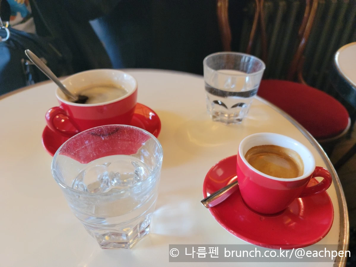 낯선 억양으로 처음 건넨 불어 한마디였지만, 잠시 뒤 빨간 잔에 담긴 두 잔의 커피가 우리 앞에 놓였다. 단순한 커피지만, 파리의 첫 아침을 여는 인사처럼 각별하게 느껴졌다. 진한 에스프레소를 천천히 음미하며 나는 속으로 중얼거렸다.