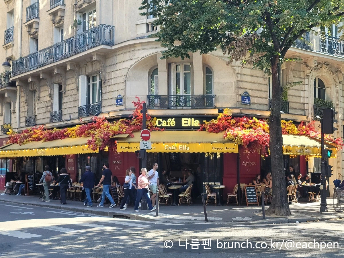 아침부터 산책 삼아 숙소 근처를 익히려 이리저리 걷다 보니, 어느덧 발걸음이 은근히 길어져 있었다. 거리에 행인도 조금 늘어나, 아침의 고요가 서서히 풀려가는 시간이었다. 그러다 문득 걸음이 멈췄다. 얼마간 걷느라 지쳐있던 탓일까, 마침 눈에 띈 카페 간판이 내 시선을 붙잡았다. “카페 엘라”(Café Ella). 동네 카페치고는 세련된 외양이 눈길을 끌었다.