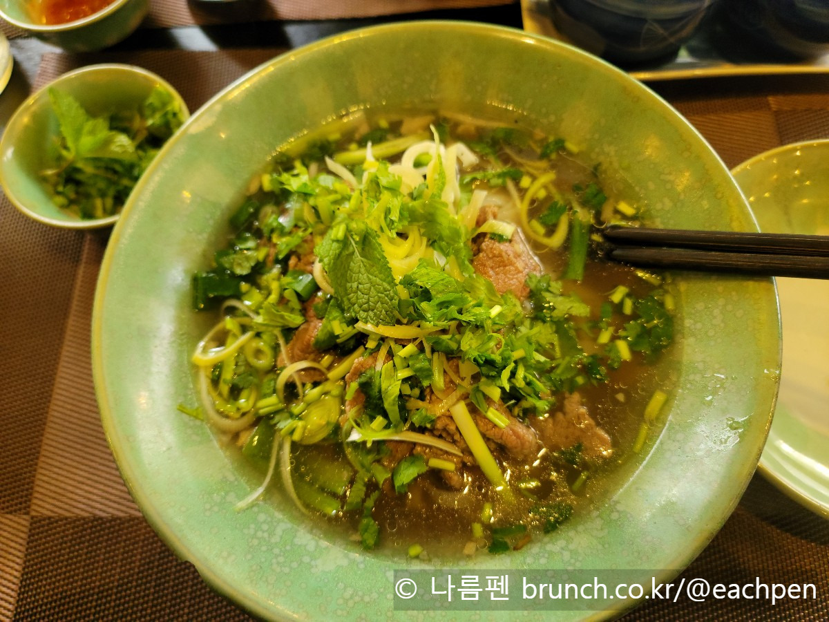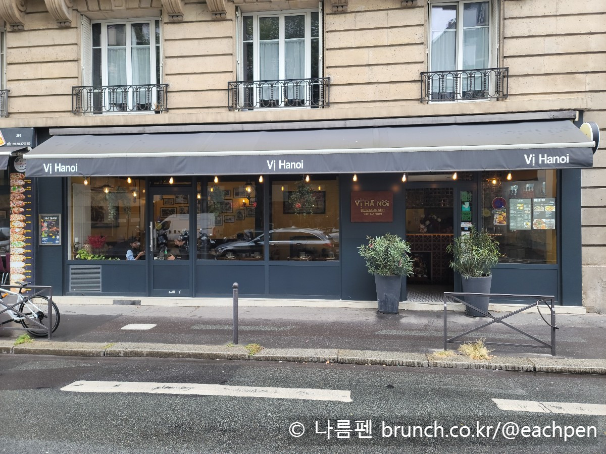 모퉁이를 돌아 걷다가 작은 베트남 쌀국숫집 ‘비 하노이’(Vi Hanoi)에 들어섰다. 지난번에 한 번 다녀갔었는데, 그런대로 맛이 좋았다. 겉보기에는 평범한 동네 식당이었지만, 내부는 의외로 활기로 가득했다. 정오가 막 지난 점심시간이라서 그런지, 비 오는 날씨 탓에 나처럼 따끈한 국물이 생각나서인지, 지난번에 왔을 때와는 달리 이미 손님들로 제법 자리가 차 있었다.