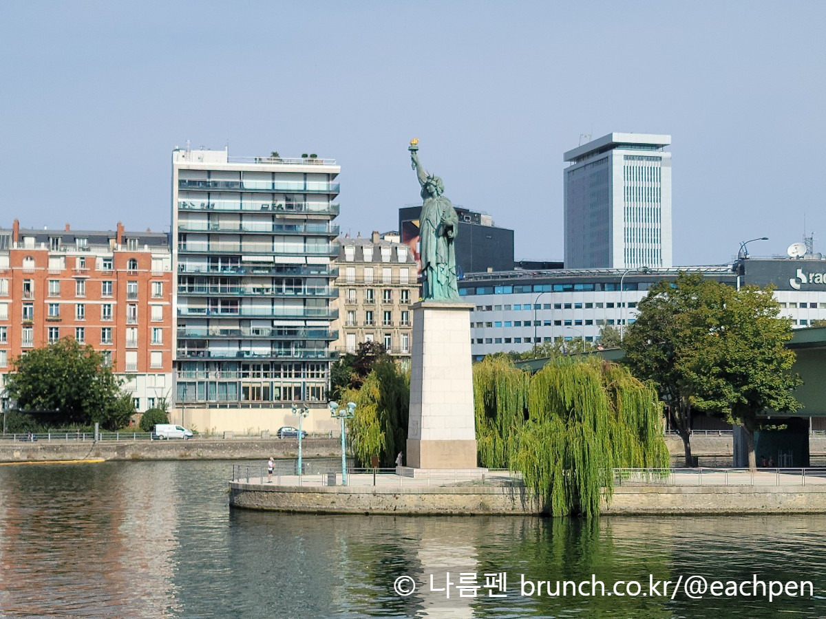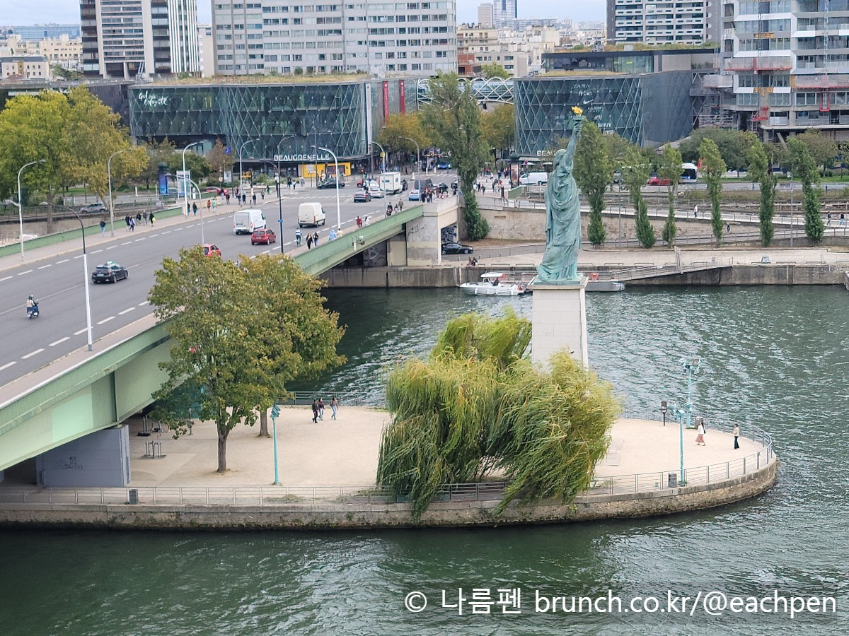 이 쇼핑몰 가까이에 있는 센강과 그르넬 다리가 떠오르자, 이내 며칠 전 걸었던 그르넬 다리 중간의 좁고 긴 인공섬 ‘시뉴 섬'(Île aux Cygnes, 백조의 섬)이 빗소리에 실려 눈앞으로 겹쳐왔다. 그 섬 서쪽 끄트머리에는 대서양을 향해 고요히 서 있는 '자유의 여신상'이 있었다. 이 조각상은 1889년 프랑스혁명 100주년을 기념해 파리 거주 미국인 공동체가 기증한 것인데, 뉴욕 '자유의 여신상'의 약 4분의 1 크기에 해당한다. 처음엔 에펠탑을 향해 서 있었으나, 지금은 대서양 건너 멀리 뉴욕의 자매상을 바라보며 서 있다.