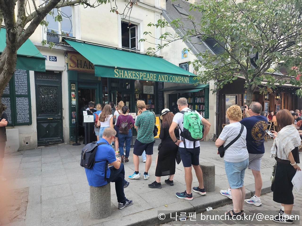 파리의 영어권 문학의 성지라는 상징성과 헤밍웨이의 유명세 덕분에, 이곳은 언제나 세계 각국의 사람들로 붐빈다. 특히 젊은 여행자들에게는 꼭 들러봐야 할 장소로 여겨져, 수많은 여행안내 책자와 블로그에 빠짐없이 이름을 올리고 있다. 서점 바로 옆에는 예전엔 내가 미처 보지 못했던 '셰익스피어 앤드 컴퍼니 카페'(Shakespeare and Company Café)가 2015년에 문을 열어, 이제는 책과 커피가 함께 어우러지는 새롭게 변화된 풍경을 자아내고 있었다. 이제 이 서점은 단순히 책을 '사는 곳'을 넘어선, 또 하나의 문화적 쉼터로 자리매김하고 있었다.